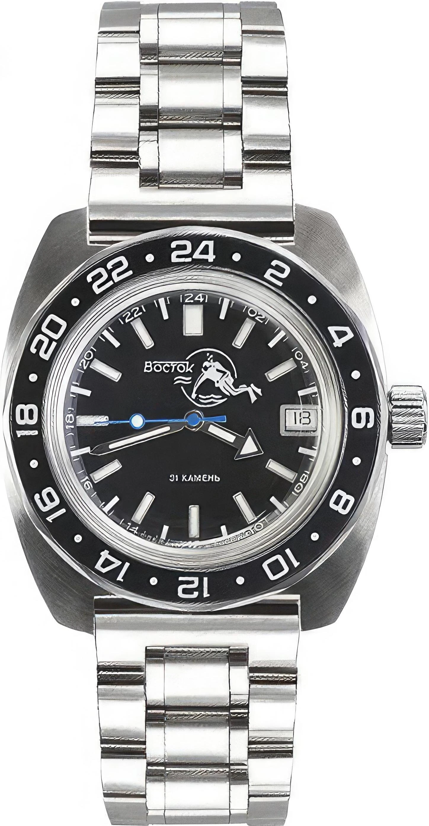 Мужские наручные часы Восток Амфибия 17006Б. Механические с ручным подзаводом. Браслет из нержавеющей стали. Браслет из нержавеющей стали. Органическое стекло. На циферблате отображается текущее число месяца. Часы являются водонепроницаемыми до 20 Бар. Цвет циферблата: Серебристый. Цвет циферблата: Черный. Цвет корпуса: Черный. На стрелки и отметки нанесен светонакопительный состав, благодаря этому считывать информацию с циферблата возможно и в темноте. Толщина: 14 мм. Гарантия: 1 год.