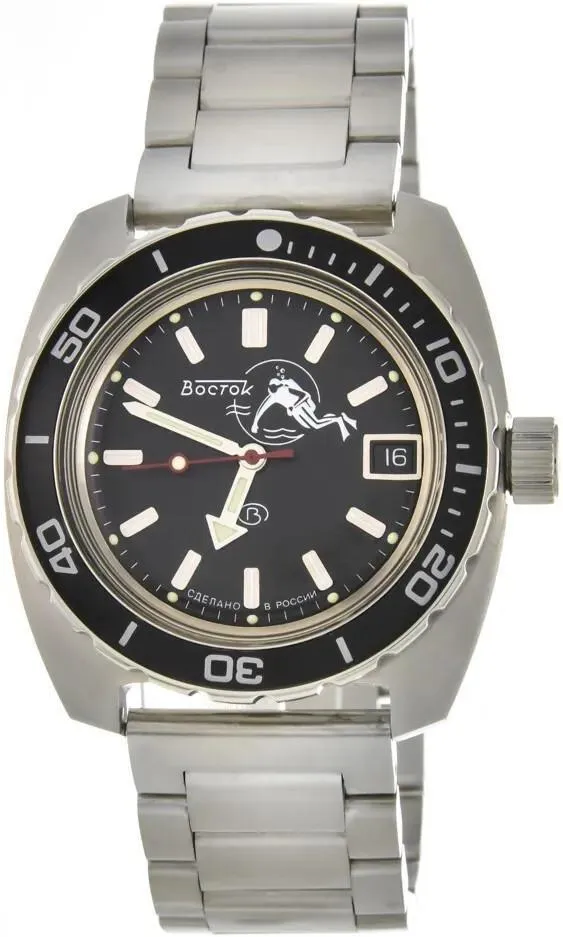 Мужские наручные часы Восток Амфибия 170600. Автоматические с ручным подзаводом. Пружина механизма заводится автоматически благодаря естественным движениям владельца в процессе ежедневной носки часов. Также есть возможность ручного завода. Корпус изготовлен из высококачественной нержавеющей стали 316L с высокими антикоррозийными свойствами. На стрелки и отметки нанесен светонакопительный состав, благодаря этому считывать информацию с циферблата возможно и в темноте. На циферблате отображается текущее число месяца. Ударопрочная конструкция часов защищает от ударов и вибрации. Полимерный ремешок. Натуральный полимерный материал является идеальным для изготовления ремешка благодаря своей чрезвычайной прочности и гибкости. Органическое стекло. Часы являются водонепроницаемыми до 20 Бар. Цвет корпуса: Серебристый. Цвет циферблата: Черный. Гарантия: 1 год.