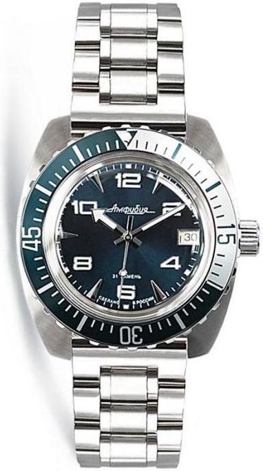 Мужские наручные часы Восток Амфибия 170894. Автоматические с ручным подзаводом. Пружина механизма заводится автоматически благодаря естественным движениям владельца в процессе ежедневной носки часов. Также есть возможность ручного завода. Корпус изготовлен из высококачественной нержавеющей стали 316L с высокими антикоррозийными свойствами. На стрелки и отметки нанесен светонакопительный состав, благодаря этому считывать информацию с циферблата возможно и в темноте. На циферблате отображается текущее число месяца. Ударопрочная конструкция часов защищает от ударов и вибрации. Браслет из нержавеющей стали. Органическое стекло. Часы являются водонепроницаемыми до 20 Бар. Цвет корпуса: Серебристый. Цвет циферблата: Синий. Гарантия: 1 год.
