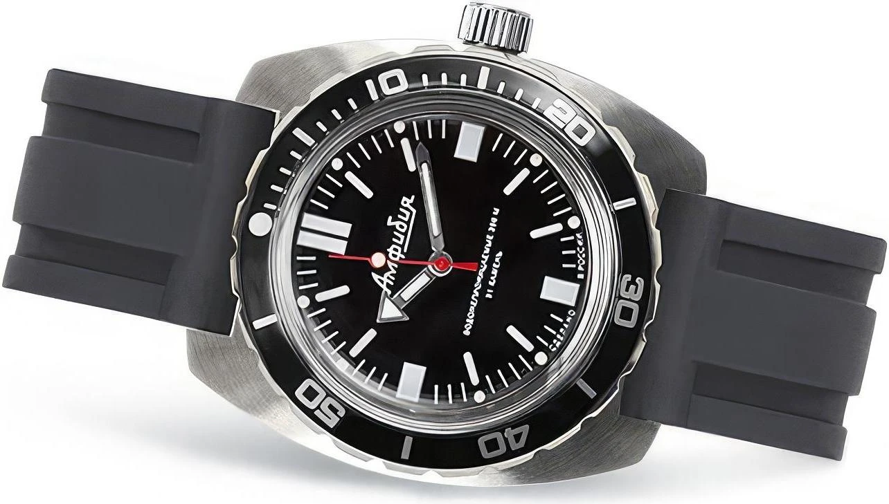 Мужские наручные часы Восток Амфибия 170916. Механические с ручным подзаводом. Полимерный ремешок. Натуральный полимерный материал является идеальным для изготовления ремешка благодаря своей чрезвычайной прочности и гибкости. Браслет из нержавеющей стали. Органическое стекло. Часы являются водонепроницаемыми до 20 Бар. Цвет циферблата: Серебристый. Цвет корпуса: Черный. Толщина: 15 мм. Гарантия: 1 год.