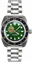 Мужские наручные часы Восток Амфибия 17099Б. Механические с ручным подзаводом. Браслет из нержавеющей стали. Ударопрочная конструкция часов защищает от ударов и вибрации. Аккумулятор обеспечивает часы достаточным питанием приблизительно на 10 лет. Браслет из нержавеющей стали. Органическое стекло. Часы являются водонепроницаемыми до 20 Бар. Цвет циферблата: Черный. Цвет корпуса: Зеленый. На стрелки и отметки нанесен светонакопительный состав, благодаря этому считывать информацию с циферблата возможно и в темноте. Высота (с ушками): 46 мм. Толщина: 15 мм. Гарантия: 1 год.