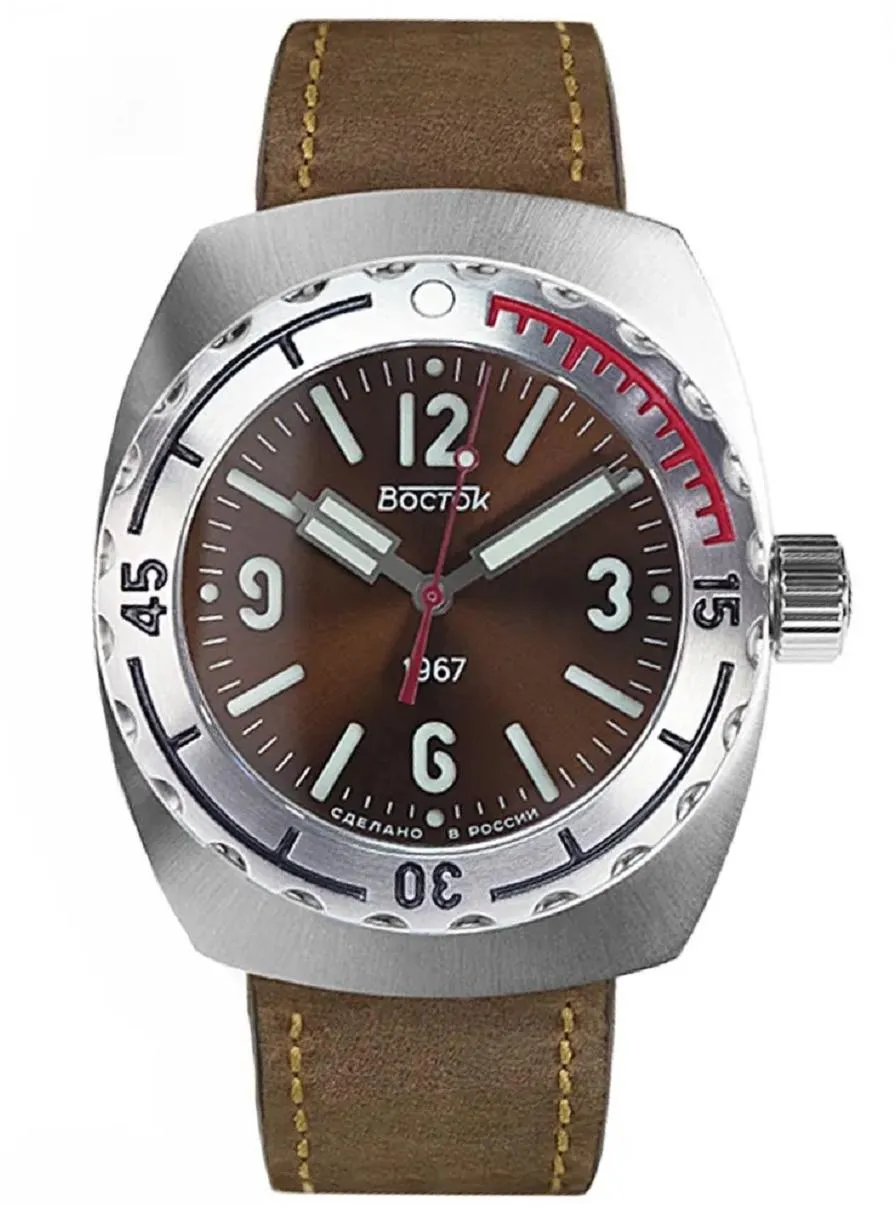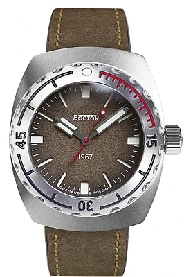 Мужские наручные часы Восток Амфибия 190040. Механические с ручным подзаводом. Ремешок изготовлен из кожи. Ударопрочная конструкция часов защищает от ударов и вибрации. Браслет из нержавеющей стали. Сапфировое стекло. Искусственно изготовленное стекло с высокой прочностью и устойчивостью к царапинам. Часы являются водонепроницаемыми до 20 Бар. Цвет циферблата: Серебристый. Цвет корпуса: Коричневый. На стрелки и отметки нанесен светонакопительный состав, благодаря этому считывать информацию с циферблата возможно и в темноте. Высота (с ушками): 50 мм. Толщина: 16 мм. Гарантия: 1 год.