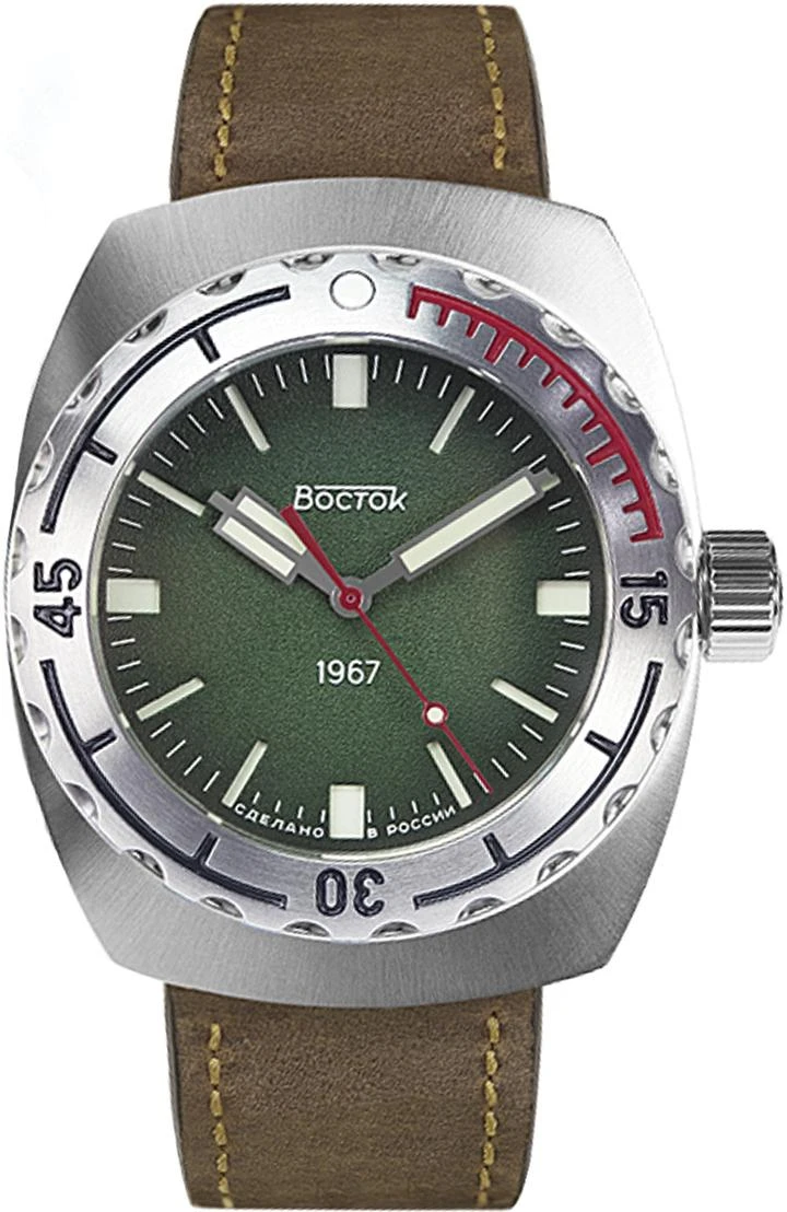 Мужские наручные часы Восток Амфибия 190061. Механические с ручным подзаводом. Ремешок изготовлен из кожи. Ударопрочная конструкция часов защищает от ударов и вибрации. Браслет из нержавеющей стали. Сапфировое стекло. Искусственно изготовленное стекло с высокой прочностью и устойчивостью к царапинам. Часы являются водонепроницаемыми до 20 Бар. Цвет циферблата: Серебристый. Цвет корпуса: Зеленый. На стрелки и отметки нанесен светонакопительный состав, благодаря этому считывать информацию с циферблата возможно и в темноте. Высота (с ушками): 50 мм. Толщина: 15 мм. Гарантия: 1 год.