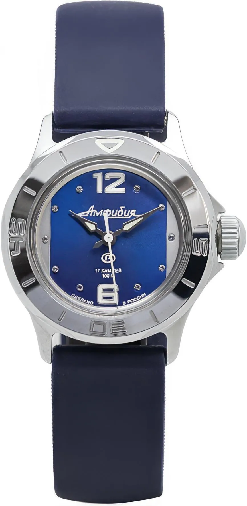 Женские наручные часы Восток Амфибия 051226. Механические с ручным подзаводом. Корпус изготовлен из высококачественной часовой латуни с высокими антикоррозийными свойствами. На стрелки и отметки нанесен светонакопительный состав, благодаря этому считывать информацию с циферблата возможно и в темноте. Ремешок изготовлен из кожи. Органическое стекло. Часы являются водонепроницаемыми до 10 Бар. Цвет циферблата: Синий. Ширина (с заводной головкой): 33мм. Толщина: 11мм. Гарантия: 1 год.