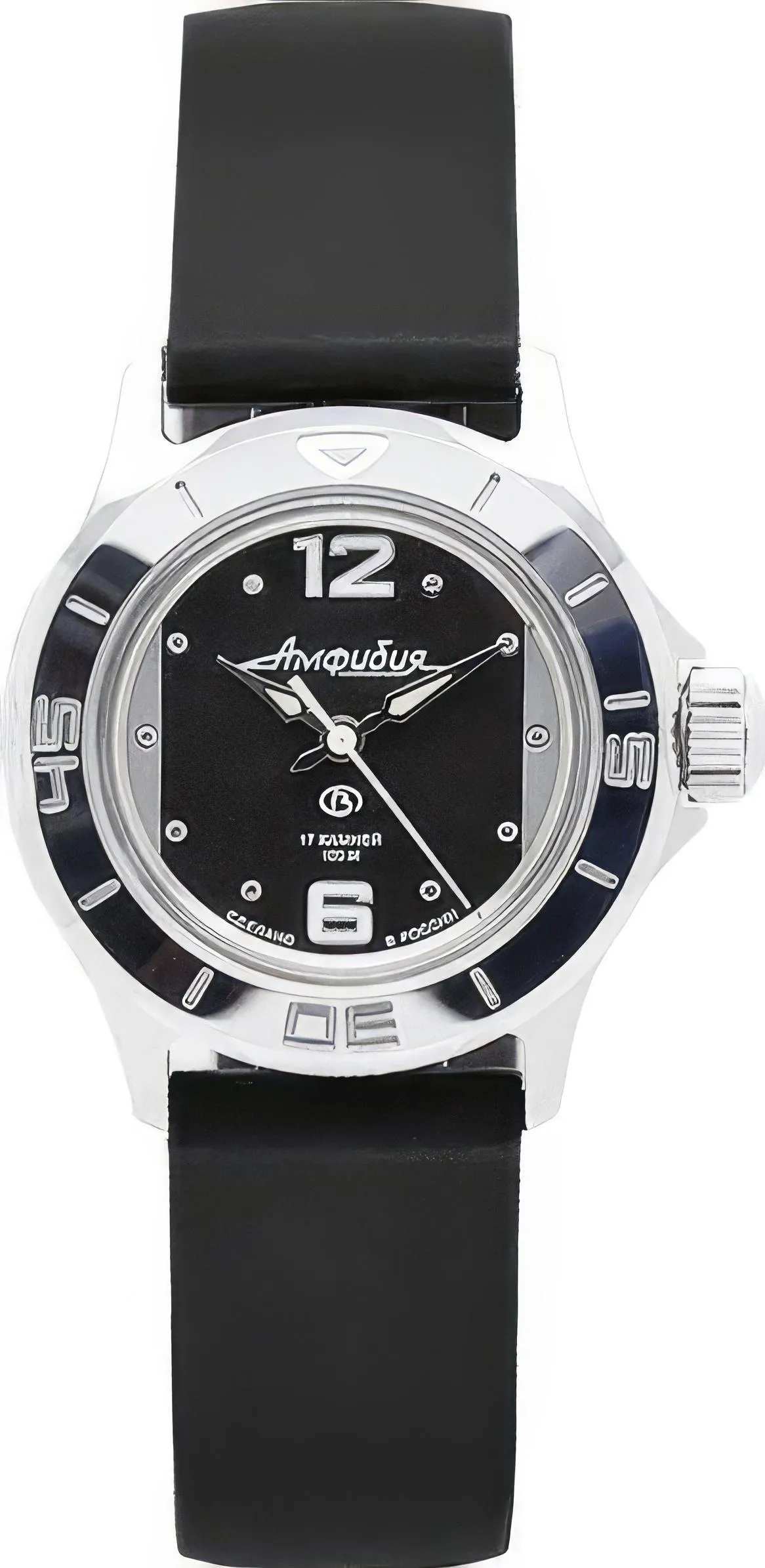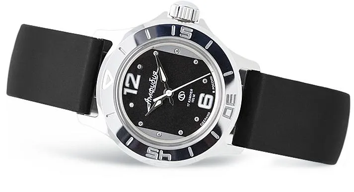 Женские наручные часы Восток Амфибия 051227. Механические с ручным подзаводом. Корпус изготовлен из высококачественной нержавеющей стали 316L с высокими антикоррозийными свойствами. На стрелки и отметки нанесен светонакопительный состав, благодаря этому считывать информацию с циферблата возможно и в темноте. Полимерный ремешок. Натуральный полимерный материал является идеальным для изготовления ремешка благодаря своей чрезвычайной прочности и гибкости. Органическое стекло. Часы являются водонепроницаемыми до 10 Бар. Цвет циферблата: Черный. Ширина (с заводной головкой): 33мм. Толщина: 11мм. Гарантия: 1 год.
