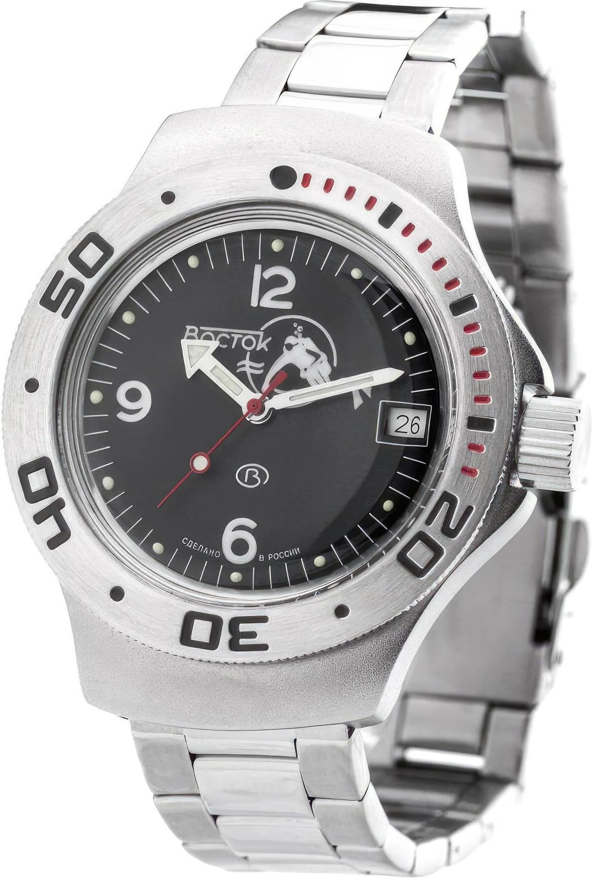 Мужские наручные часы Восток Амфибия 060634. Механические с автоподзаводом. Пружина механизма заводится автоматически благодаря естественным движениям владельца в процессе ежедневной носки часов. Корпус изготовлен из высококачественной нержавеющей стали 316L с высокими антикоррозийными свойствами. На стрелки и отметки нанесен светонакопительный состав, благодаря этому считывать информацию с циферблата возможно и в темноте. На циферблате отображается текущее число месяца. Браслет из нержавеющей стали. Органическое стекло. Часы являются водонепроницаемыми до 20 Бар. Цвет корпуса: Двухцветный. Цвет циферблата: Черный. Ширина (с заводной головкой): 42мм. Толщина: 13мм. Гарантия: 1 год.