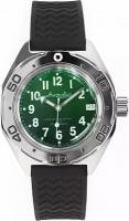 Мужские наручные часы Восток Амфибия 67068Б. Механические с ручным подзаводом. Полимерный ремешок. Натуральный полимерный материал является идеальным для изготовления ремешка благодаря своей чрезвычайной прочности и гибкости. Ударопрочная конструкция часов защищает от ударов и вибрации. Браслет из нержавеющей стали. Органическое стекло. На циферблате отображается текущее число месяца. Часы являются водонепроницаемыми до 20 Бар. Цвет циферблата: Серебристый. Цвет корпуса: Зеленый. На стрелки и отметки нанесен светонакопительный состав, благодаря этому считывать информацию с циферблата возможно и в темноте. Высота (с ушками): 49 мм. Толщина: 15 мм. Гарантия: 1 год.