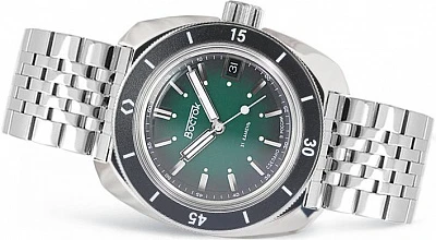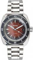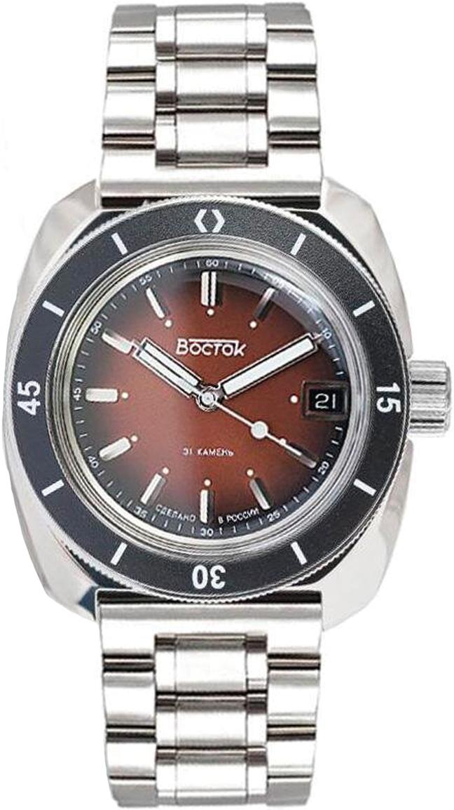 Мужские наручные часы Восток Амфибия 71003А. Механические с ручным подзаводом. Браслет из нержавеющей стали. Ударопрочная конструкция часов защищает от ударов и вибрации. Браслет из нержавеющей стали. Органическое стекло. На циферблате отображается текущее число месяца. Часы являются водонепроницаемыми до 3 Бар. Цвет циферблата: Черный. Цвет корпуса: Коричневый. На стрелки и отметки нанесен светонакопительный состав, благодаря этому считывать информацию с циферблата возможно и в темноте. Высота (с ушками): 46 мм. Толщина: 15 мм. Гарантия: 1 год.