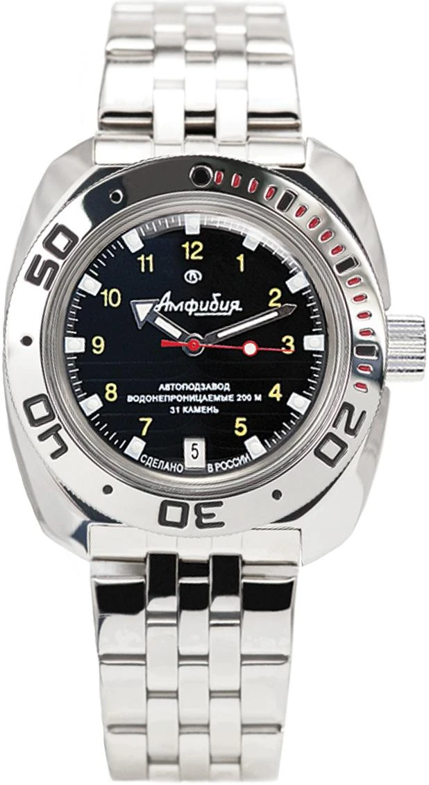 Мужские наручные часы Восток Амфибия 710270. Механические с ручным подзаводом. Браслет из нержавеющей стали. Браслет из нержавеющей стали. Органическое стекло. На циферблате отображается текущее число месяца. Часы являются водонепроницаемыми до 20 Бар. Цвет циферблата: Серебристый. Цвет корпуса: Черный. На стрелки и отметки нанесен светонакопительный состав, благодаря этому считывать информацию с циферблата возможно и в темноте. Высота (с ушками): 46 мм. Толщина: 15 мм. Гарантия: 1 год.