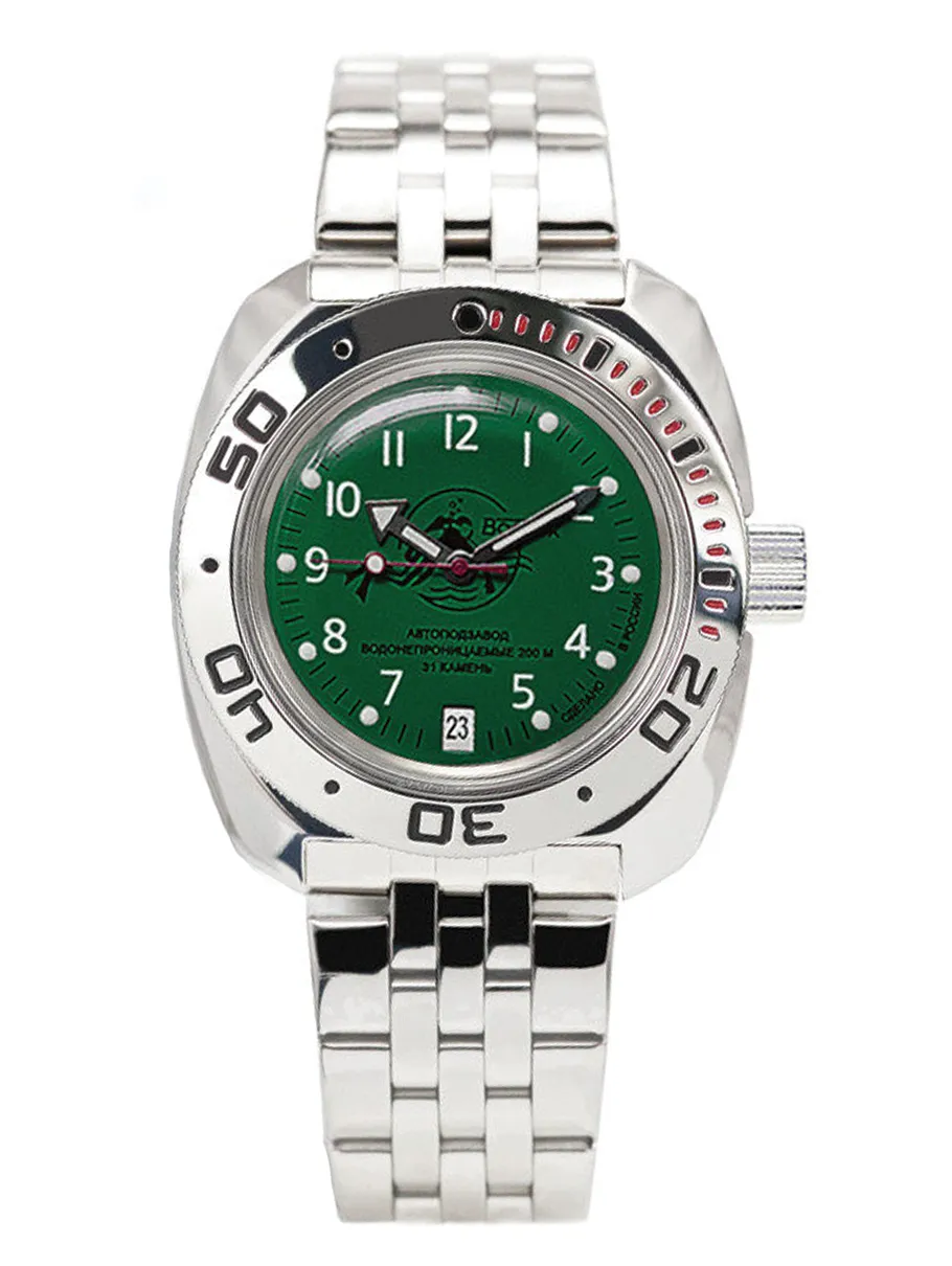 Мужские наручные часы Восток Амфибия 710386. Механические с ручным подзаводом. Браслет из нержавеющей стали. Ударопрочная конструкция часов защищает от ударов и вибрации. Браслет из нержавеющей стали. Органическое стекло. На циферблате отображается текущее число месяца. Часы являются водонепроницаемыми до 20 Бар. Цвет циферблата: Серебристый. Цвет корпуса: Зеленый. На стрелки и отметки нанесен светонакопительный состав, благодаря этому считывать информацию с циферблата возможно и в темноте. Высота (с ушками): 46 мм. Толщина: 15 мм. Гарантия: 1 год.
