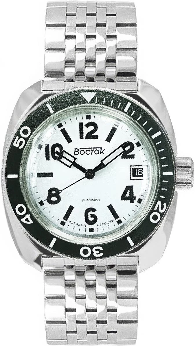Мужские наручные часы Восток Амфибия 71049В. Механические с ручным подзаводом. Браслет из нержавеющей стали. Ударопрочная конструкция часов защищает от ударов и вибрации. Браслет из нержавеющей стали. Органическое стекло. На циферблате отображается текущее число месяца. Часы являются водонепроницаемыми до 20 Бар. Цвет циферблата: Черный. Цвет корпуса: Белый. На стрелки и отметки нанесен светонакопительный состав, благодаря этому считывать информацию с циферблата возможно и в темноте. Высота (с ушками): 46 мм. Толщина: 15 мм. Гарантия: 1 год.