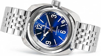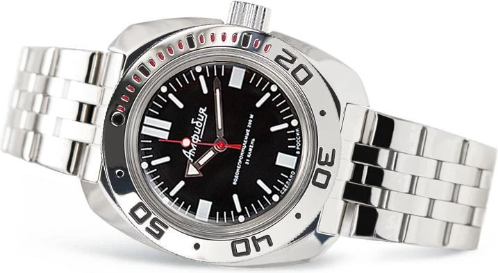 Мужские наручные часы Восток Амфибия 710916. Механические с ручным подзаводом. Браслет из нержавеющей стали. Браслет из нержавеющей стали. Органическое стекло. Часы являются водонепроницаемыми до 20 Бар. Цвет циферблата: Серебристый. Цвет корпуса: Черный. На стрелки и отметки нанесен светонакопительный состав, благодаря этому считывать информацию с циферблата возможно и в темноте. Толщина: 15 мм. Гарантия: 1 год.