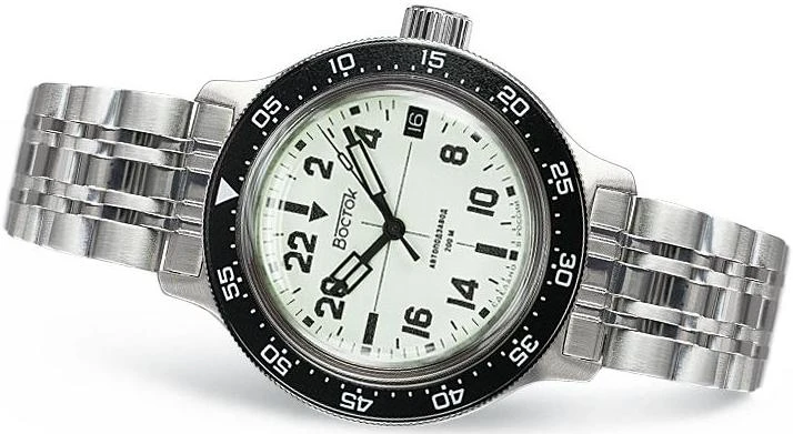 Мужские наручные часы Восток Амфибия 72014Б. Механические с ручным подзаводом. Браслет из нержавеющей стали. Браслет из нержавеющей стали. Органическое стекло. На циферблате отображается текущее число месяца. Часы являются водонепроницаемыми до 20 Бар. Цвет циферблата: Серебристый. Цвет циферблата: Черный. Цвет корпуса: Бежевый. На стрелки и отметки нанесен светонакопительный состав, благодаря этому считывать информацию с циферблата возможно и в темноте. Толщина: 13 мм. Гарантия: 1 год.