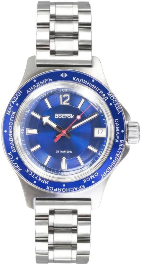 Мужские наручные часы Восток Амфибия 740015. Автоматические с ручным подзаводом. Пружина механизма заводится автоматически благодаря естественным движениям владельца в процессе ежедневной носки часов. Также есть возможность ручного завода. Браслет из нержавеющей стали. Ударопрочная конструкция часов защищает от ударов и вибрации. Браслет из нержавеющей стали. Органическое стекло. На циферблате отображается текущее число месяца. Часы являются водонепроницаемыми до 20 Бар. Цвет циферблата: Серебристый. Цвет циферблата: Синий. Цвет корпуса: Синий. На стрелки и отметки нанесен светонакопительный состав, благодаря этому считывать информацию с циферблата возможно и в темноте. Толщина: 13 мм. Гарантия: 1 год.