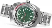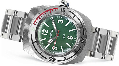 Мужские наручные часы Восток Амфибия 90082А. Механические с ручным подзаводом. Браслет из нержавеющей стали. Браслет из нержавеющей стали. Органическое стекло. Часы являются водонепроницаемыми до 20 Бар. Цвет циферблата: Серебристый. Цвет корпуса: Зеленый. На стрелки и отметки нанесен светонакопительный состав, благодаря этому считывать информацию с циферблата возможно и в темноте. Толщина: 15 мм. Гарантия: 1 год.