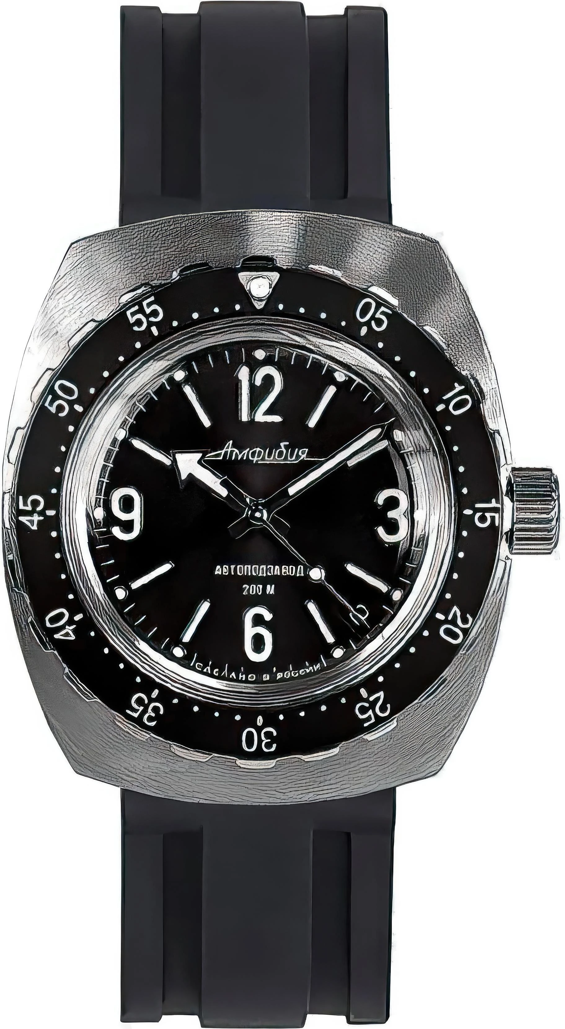 Мужские наручные часы Восток Амфибия 900972. Механические с ручным подзаводом. Полимерный ремешок. Натуральный полимерный материал является идеальным для изготовления ремешка благодаря своей чрезвычайной прочности и гибкости. Ударопрочная конструкция часов защищает от ударов и вибрации. Браслет изготовлен из алюминия. Органическое стекло. Часы являются водонепроницаемыми до 20 Бар. Цвет циферблата: Серебристый. Цвет циферблата: Черный. Цвет корпуса: Черный. На стрелки и отметки нанесен светонакопительный состав, благодаря этому считывать информацию с циферблата возможно и в темноте. Толщина: 13 мм. Гарантия: 1 год.