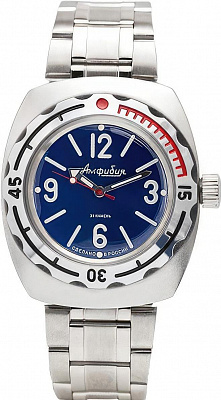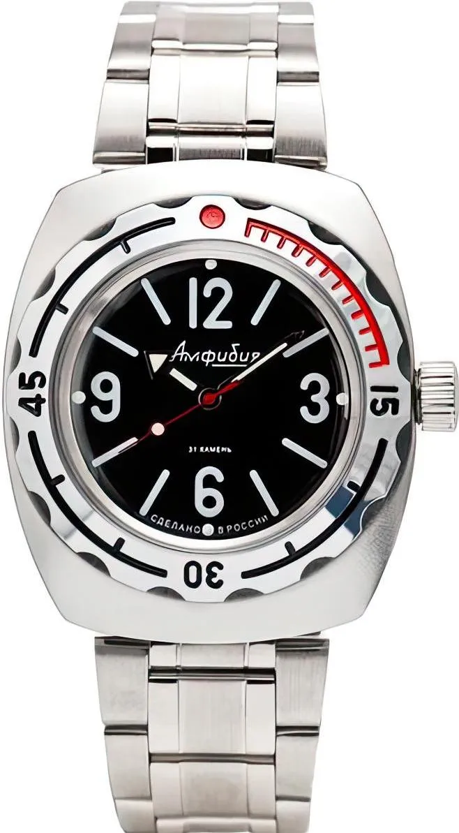 Мужские наручные часы Восток Амфибия 090913. Механические с автоподзаводом. Пружина механизма заводится автоматически благодаря естественным движениям владельца в процессе ежедневной носки часов. Корпус изготовлен из высококачественной нержавеющей стали 316L с высокими антикоррозийными свойствами. На стрелки и отметки нанесен светонакопительный состав, благодаря этому считывать информацию с циферблата возможно и в темноте. На циферблате отображается текущее число месяца. Браслет из нержавеющей стали. Органическое стекло. Часы являются водонепроницаемыми до 20 Бар. Цвет корпуса: Черный. Цвет циферблата: Черный. Ширина (с заводной головкой): 42мм. Толщина: 15мм. Гарантия: 1 год.