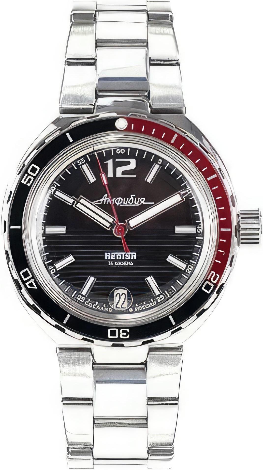 Мужские наручные часы Восток Амфибия 960760. Механические с автоподзаводом. Пружина механизма заводится автоматически благодаря естественным движениям владельца в процессе ежедневной носки часов. Корпус изготовлен из высококачественной нержавеющей стали 316L с высокими антикоррозийными свойствами. На стрелки и отметки нанесен светонакопительный состав, благодаря этому считывать информацию с циферблата возможно и в темноте. На циферблате отображается текущее число месяца. Браслет из нержавеющей стали. Органическое стекло. Часы являются водонепроницаемыми до 20 Бар. Цвет циферблата: Черный. Ширина (с заводной головкой): 40мм. Толщина: 15мм. Гарантия: 1 год.
