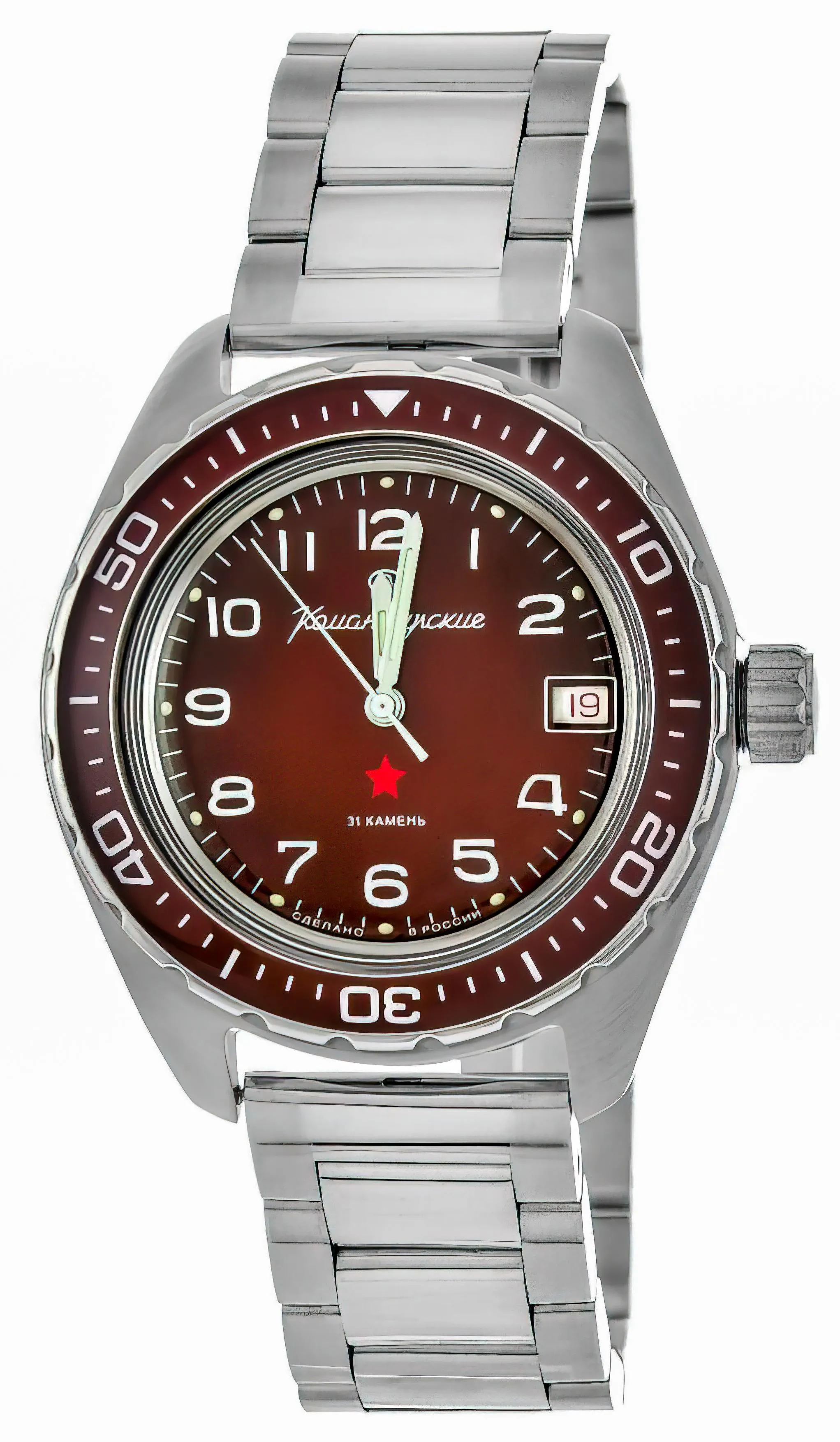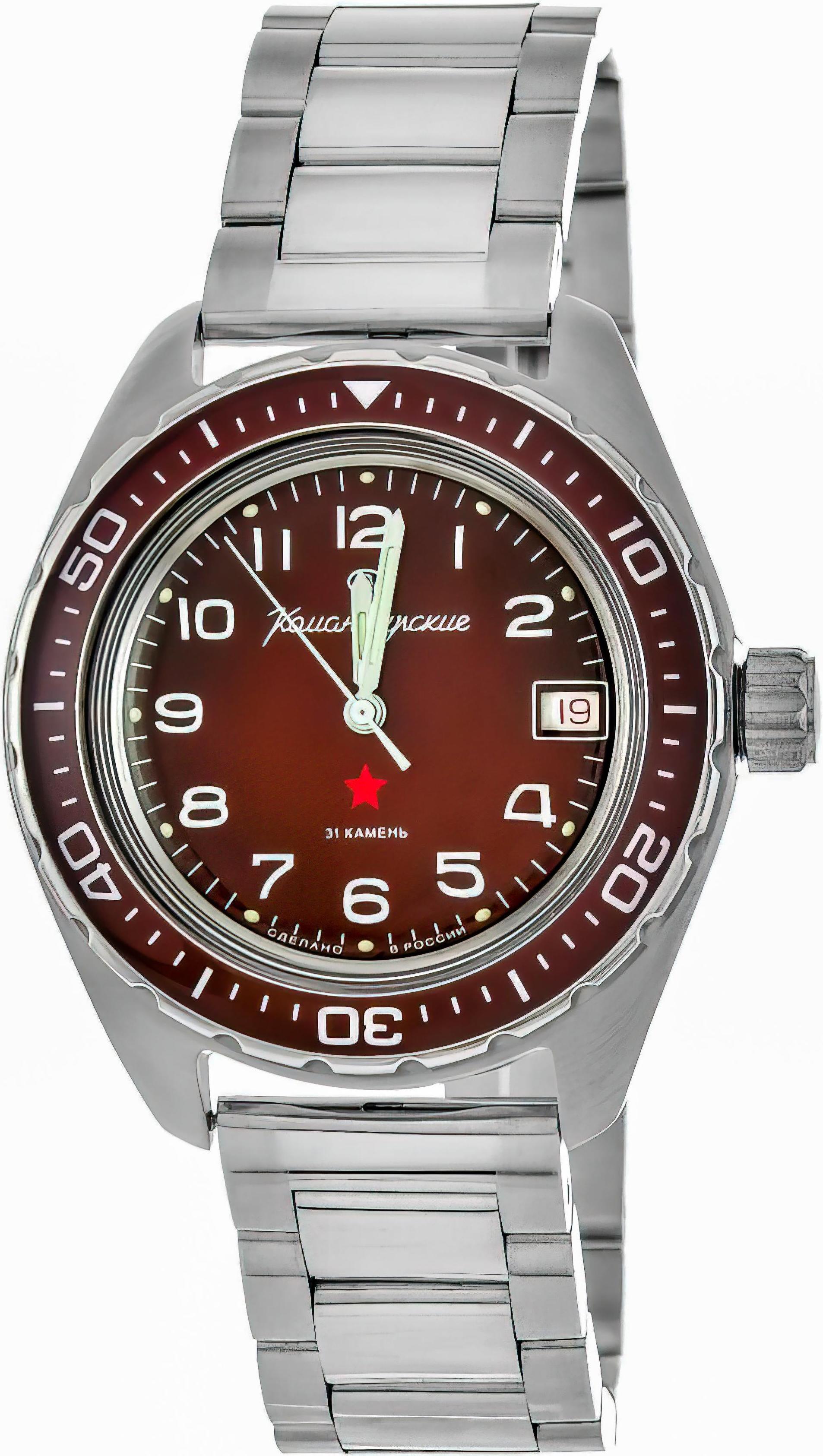 Мужские наручные часы Восток Командирские 02032А. Механические с ручным подзаводом. Браслет из нержавеющей стали. Браслет из нержавеющей стали. Органическое стекло. На циферблате отображается текущее число месяца. Часы являются водонепроницаемыми до 20 Бар. Цвет циферблата: Красный. Цвет циферблата: Серебристый. Цвет корпуса: Красный. На стрелки и отметки нанесен светонакопительный состав, благодаря этому считывать информацию с циферблата возможно и в темноте. Толщина: 15 мм. Гарантия: 1 год.