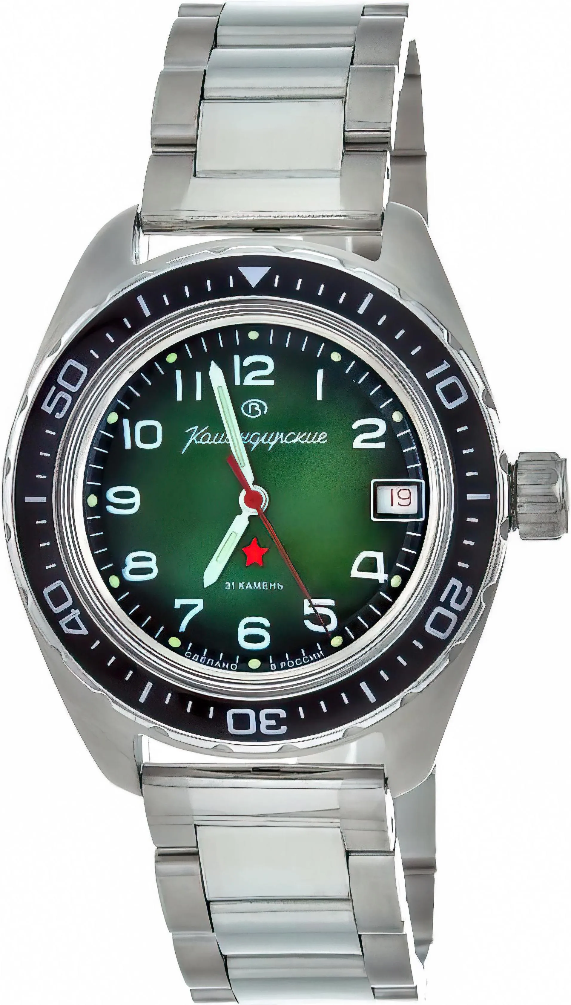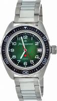 Мужские наручные часы Восток Командирские 02033А. Механические с ручным подзаводом. Браслет из нержавеющей стали. Браслет из нержавеющей стали. Органическое стекло. На циферблате отображается текущее число месяца. Часы являются водонепроницаемыми до 20 Бар. Цвет циферблата: Серебристый. Цвет циферблата: Черный. Цвет корпуса: Зеленый. На стрелки и отметки нанесен светонакопительный состав, благодаря этому считывать информацию с циферблата возможно и в темноте. Толщина: 15 мм. Гарантия: 1 год.