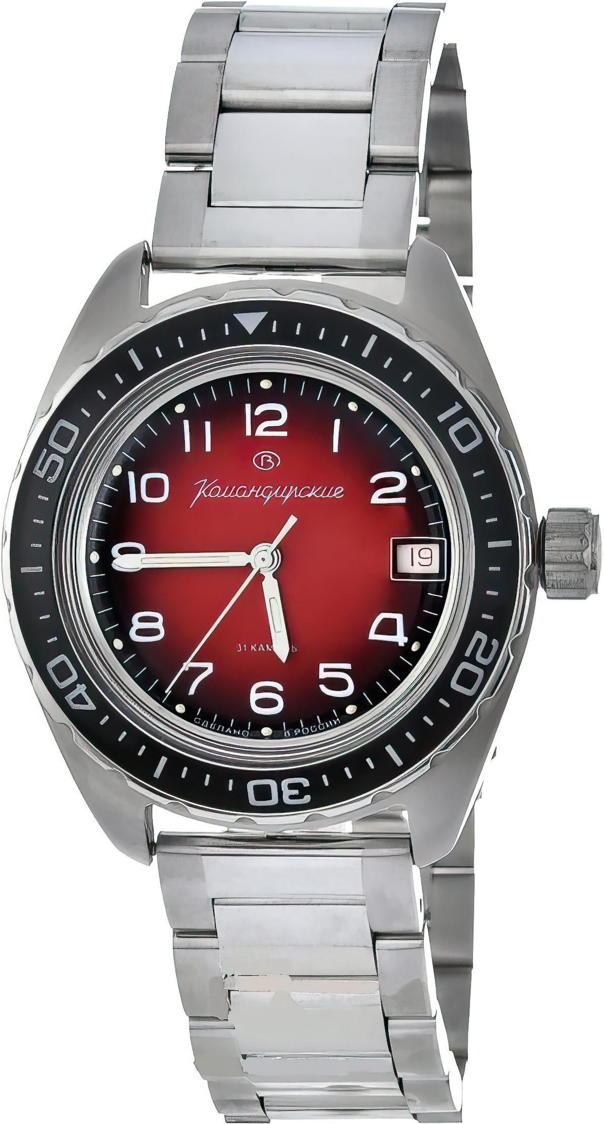 Мужские наручные часы Восток Командирские 02035А. Механические с ручным подзаводом. Браслет из нержавеющей стали. Браслет из нержавеющей стали. Органическое стекло. На циферблате отображается текущее число месяца. Часы являются водонепроницаемыми до 20 Бар. Цвет циферблата: Серебристый. Цвет циферблата: Черный. Цвет корпуса: Красный. Цвет корпуса: Черный. На стрелки и отметки нанесен светонакопительный состав, благодаря этому считывать информацию с циферблата возможно и в темноте. Толщина: 15 мм. Гарантия: 1 год.