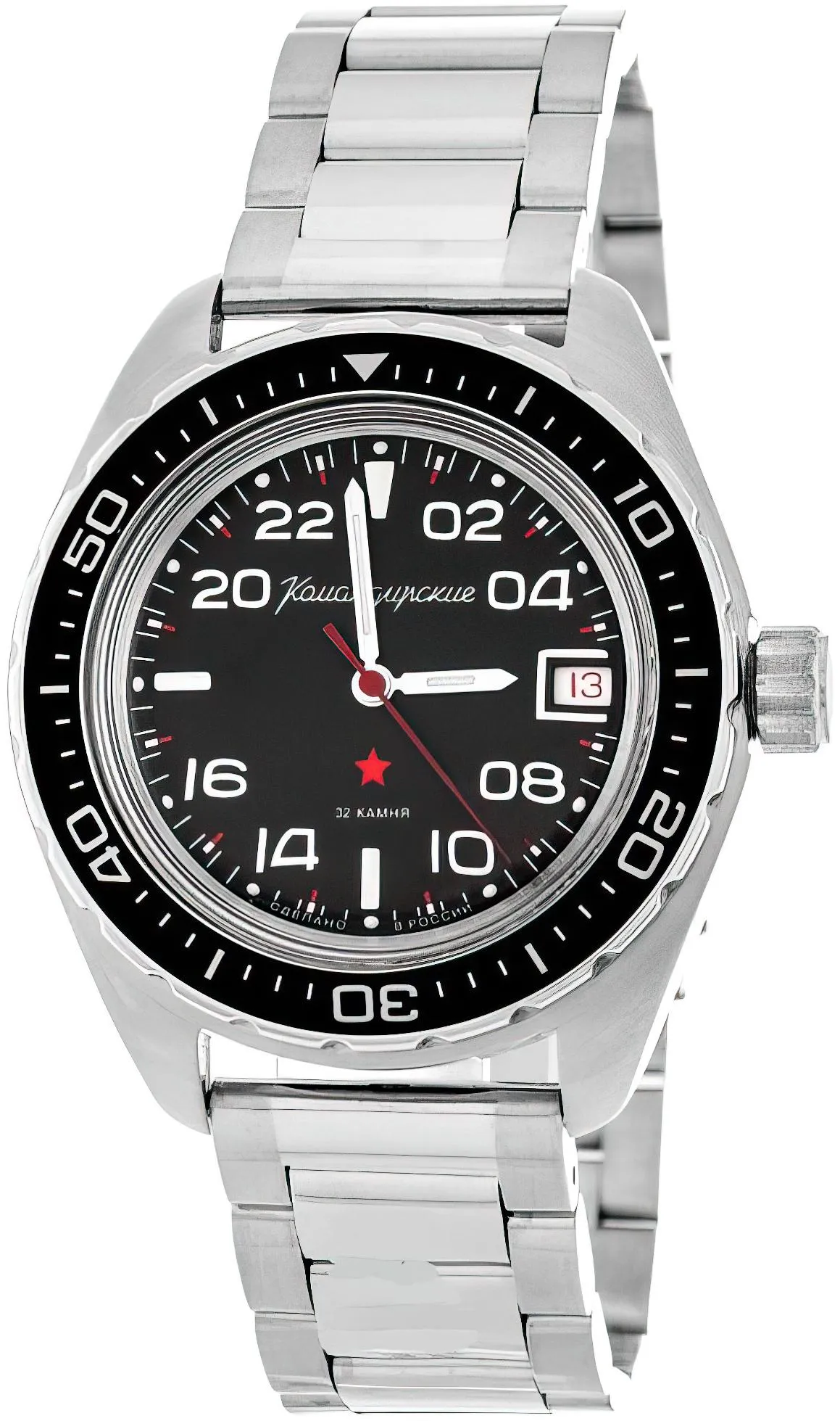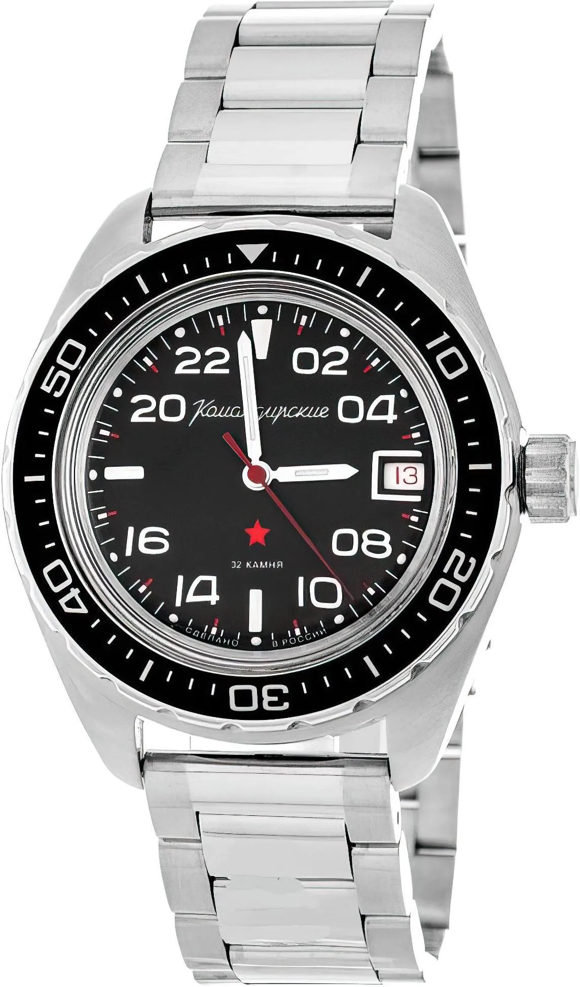Мужские наручные часы Восток Командирские 02037А. Механические с ручным подзаводом. Браслет из нержавеющей стали. Браслет из нержавеющей стали. Органическое стекло. На циферблате отображается текущее число месяца. Часы являются водонепроницаемыми до 20 Бар. Цвет циферблата: Серебристый. Цвет циферблата: Черный. Цвет корпуса: Черный. На стрелки и отметки нанесен светонакопительный состав, благодаря этому считывать информацию с циферблата возможно и в темноте. Толщина: 15 мм. Гарантия: 1 год.