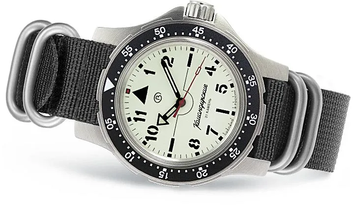 Мужские наручные часы Восток Командирские 18028А. Механические с ручным подзаводом. Корпус изготовлен из высококачественной нержавеющей стали 316L с высокими антикоррозийными свойствами. На стрелки и отметки нанесен светонакопительный состав, благодаря этому считывать информацию с циферблата возможно и в темноте. Текстильный ремешок. Органическое стекло. Часы являются водонепроницаемыми до 20 Бар. Цвет корпуса: Черный. Цвет циферблата: Бежевый. Ширина (с заводной головкой): 44мм. Толщина: 13мм. Гарантия: 1 год.