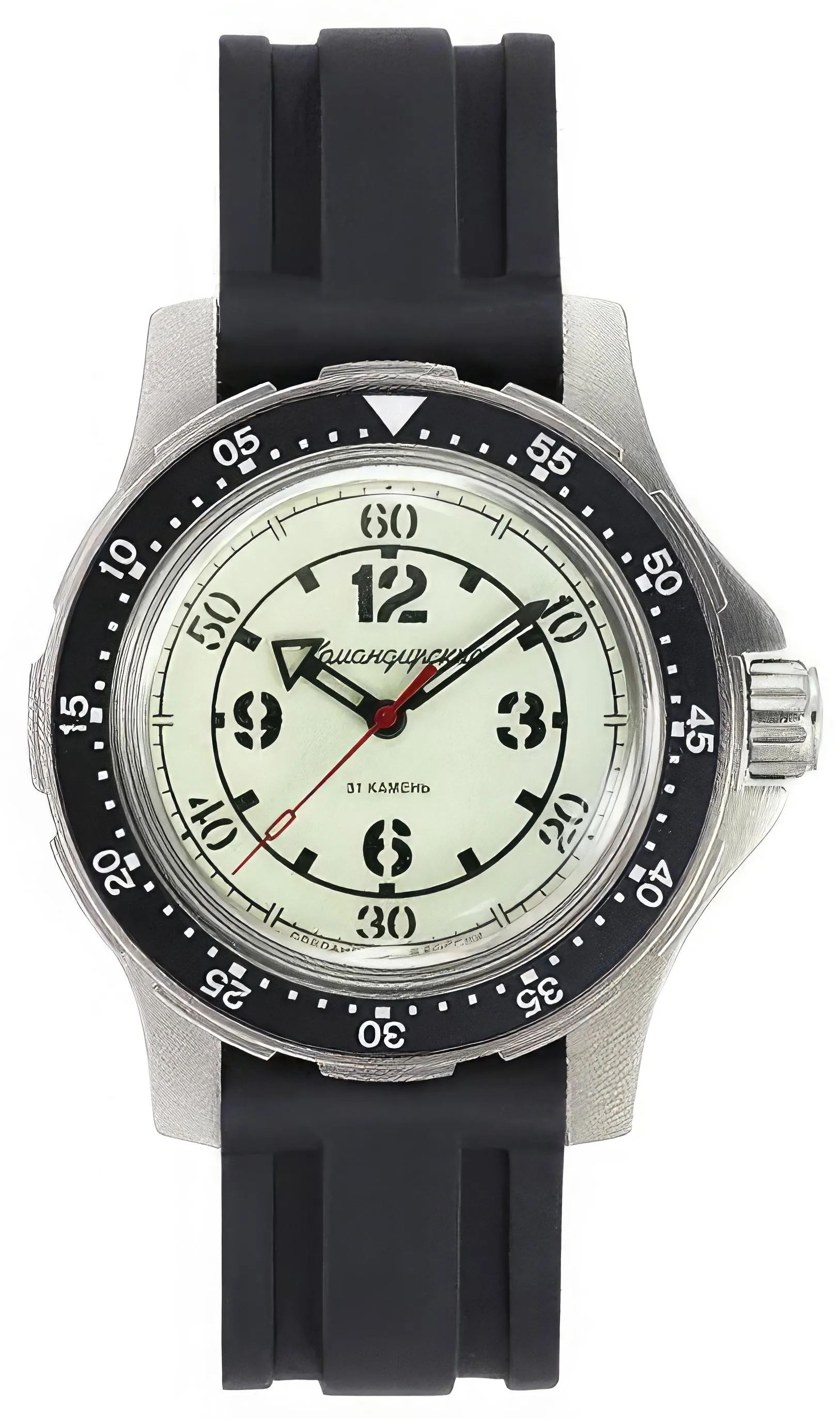 Мужские наручные часы Восток Командирские 18088А. Механические с ручным подзаводом. Полимерный ремешок. Натуральный полимерный материал является идеальным для изготовления ремешка благодаря своей чрезвычайной прочности и гибкости. Браслет из нержавеющей стали. Органическое стекло. Часы являются водонепроницаемыми до 20 Бар. Цвет циферблата: Серебристый. Цвет циферблата: Черный. Цвет корпуса: Белый. На стрелки и отметки нанесен светонакопительный состав, благодаря этому считывать информацию с циферблата возможно и в темноте. Толщина: 12 мм. Гарантия: 1 год.