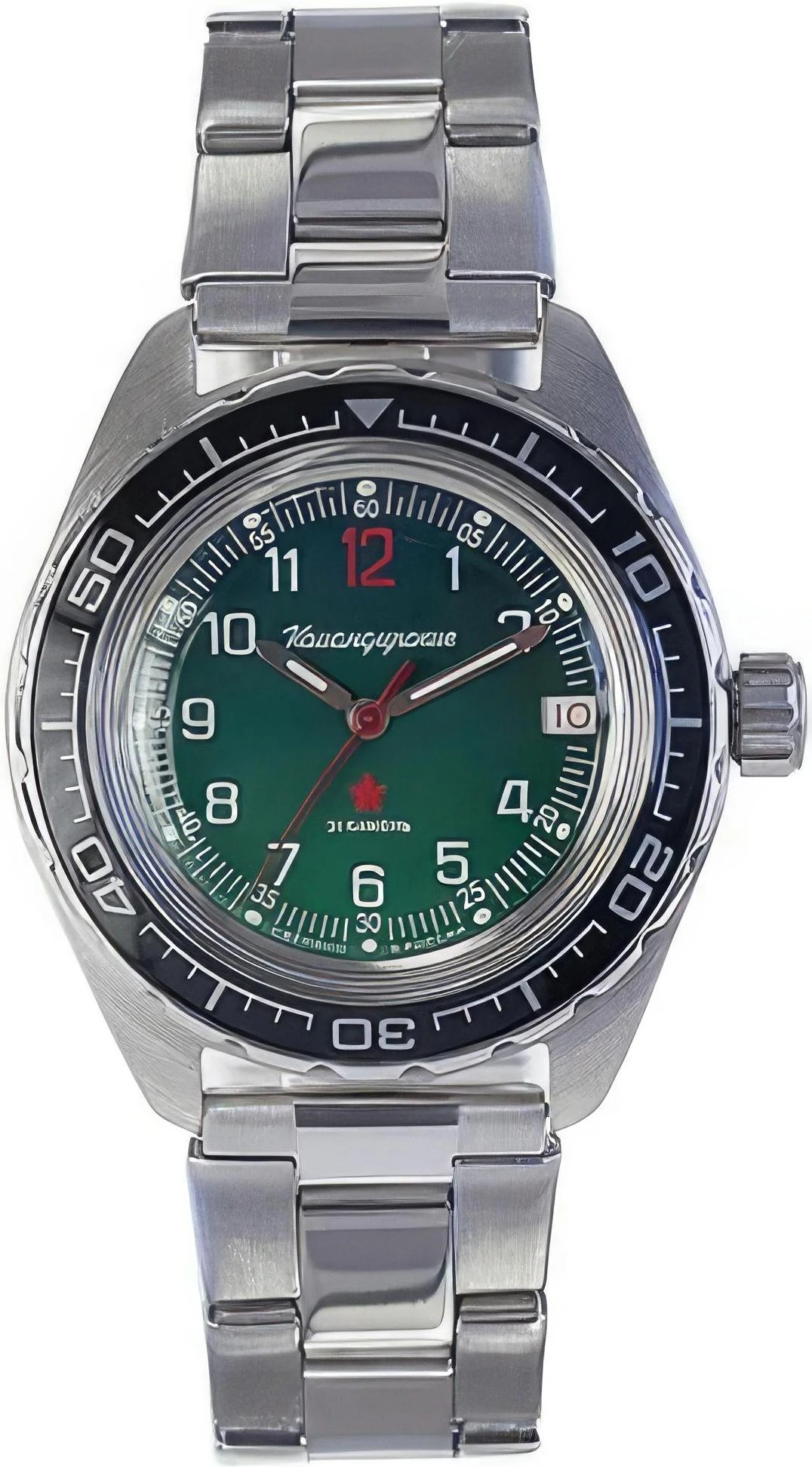 Мужские наручные часы Восток Командирские 020711. Механические с автоподзаводом. Пружина механизма заводится автоматически благодаря естественным движениям владельца в процессе ежедневной носки часов. Корпус изготовлен из высококачественной нержавеющей стали 316L с высокими антикоррозийными свойствами. На стрелки и отметки нанесен светонакопительный состав, благодаря этому считывать информацию с циферблата возможно и в темноте. На циферблате отображается текущее число месяца. Браслет из нержавеющей стали. Органическое стекло. Часы являются водонепроницаемыми до 20 Бар. Ширина (с заводной головкой): 42мм. Толщина: 15мм. Гарантия: 1 год.
