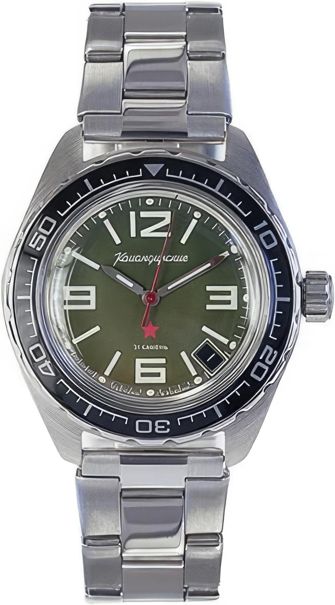 Мужские наручные часы Восток Командирские 020715. Механические с автоподзаводом. Пружина механизма заводится автоматически благодаря естественным движениям владельца в процессе ежедневной носки часов. Корпус изготовлен из высококачественной нержавеющей стали 316L с высокими антикоррозийными свойствами. На стрелки и отметки нанесен светонакопительный состав, благодаря этому считывать информацию с циферблата возможно и в темноте. На циферблате отображается текущее число месяца. Браслет из нержавеющей стали. Органическое стекло. Часы являются водонепроницаемыми до 20 Бар. Цвет корпуса: Двухцветный. Цвет циферблата: Зеленый. Ширина (с заводной головкой): 42мм. Толщина: 15мм. Гарантия: 1 год.