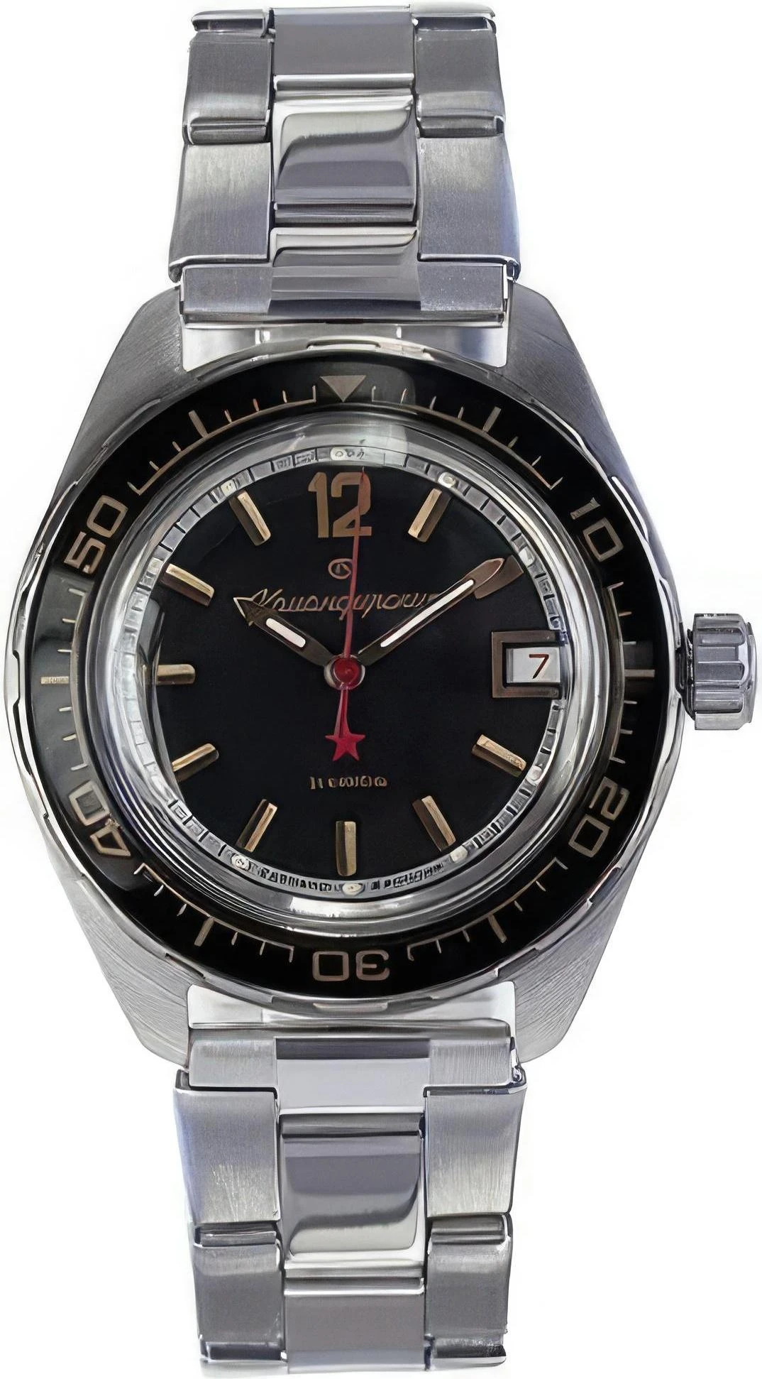 Мужские наручные часы Восток Командирские 020741. Механические с автоподзаводом. Пружина механизма заводится автоматически благодаря естественным движениям владельца в процессе ежедневной носки часов. Корпус изготовлен из высококачественной нержавеющей стали 316L с высокими антикоррозийными свойствами. На стрелки и отметки нанесен светонакопительный состав, благодаря этому считывать информацию с циферблата возможно и в темноте. На циферблате отображается текущее число месяца. Браслет из нержавеющей стали. Органическое стекло. Часы являются водонепроницаемыми до 20 Бар. Цвет корпуса: Двухцветный. Цвет циферблата: Черный. Ширина (с заводной головкой): 42мм. Толщина: 15мм. Гарантия: 1 год.
