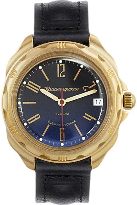 Мужские наручные часы Восток Командирские 21716Г. Механические с ручным подзаводом. Завод осуществляется через систему шестерней, передающих вращение с головки на заводной барабан. Механизм включает предохранительную систему, предотвращающую перезавод главной пружины.Ремешок изготовлен из кожи. Гибкость такого ремешка позволяет точно регулировать посадку часов на руке. Ударопрочная конструкция часов защищает от ударов и вибрации. Корпус изготовлен из высококачественной часовой латуни с высокими антикоррозийными свойствами. Органическое стекло. Часы являются водонепроницаемыми до 3 Бар. Цвет корпуса: Желтое золото. Цвет циферблата: Синий. Цвет циферблата: Черный. Высота (с ушками): 44.4 мм. Толщина: 12 мм. Гарантия: 1 год.