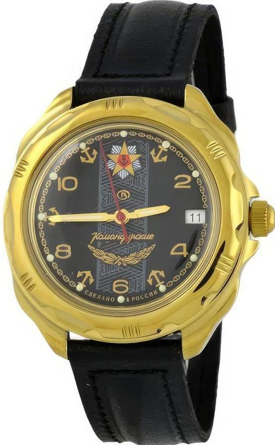 Мужские наручные часы Восток Командирские 219471. Механические с ручным подзаводом. Корпус изготовлен из высококачественной часовой латуни с высокими антикоррозийными свойствами. На стрелки и отметки нанесен светонакопительный состав, благодаря этому считывать информацию с циферблата возможно и в темноте. На циферблате отображается текущее число месяца. Ремешок изготовлен из кожи. Прочное, устойчивое к царапинам минеральное стекло защищает часы от повреждений.Часы являются водонепроницаемыми до 3 Бар. Цвет корпуса: Желтое золото. Цвет циферблата: Черный. Ширина (с заводной головкой): 40мм. Толщина: 10мм. Гарантия: 1 год.