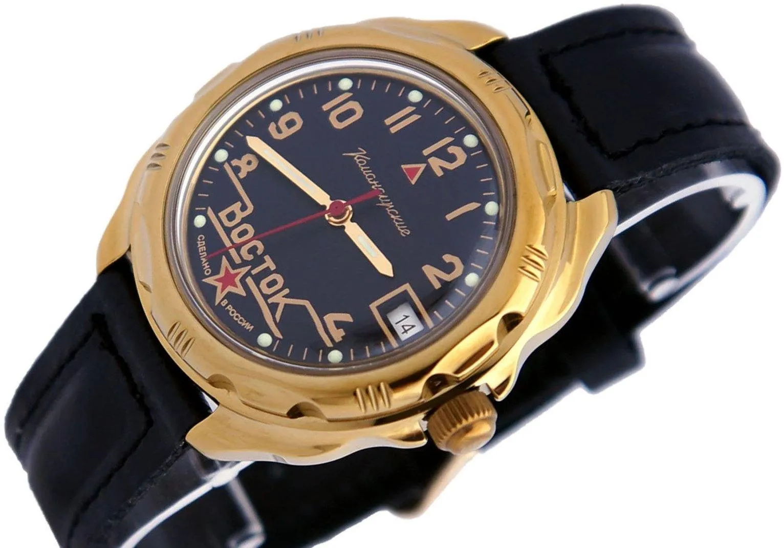 <b>Мужские наручные часы Восток Командирские 219524.</b> Механические с ручным подзаводом. Корпус изготовлен из высококачественной часовой латуни с высокими антикоррозийными свойствами. На стрелки и отметки нанесен светонакопительный состав, благодаря этому считывать информацию с циферблата возможно и в темноте. На циферблате отображается текущее число месяца. Ремешок изготовлен из кожи. Прочное, устойчивое к царапинам минеральное стекло защищает часы от повреждений.Часы являются водонепроницаемыми до 3 Бар. Цвет корпуса: Желтое золото. Цвет циферблата: Черный. Ширина (с заводной головкой): 40мм. Толщина: 10мм. Гарантия: 1 год.