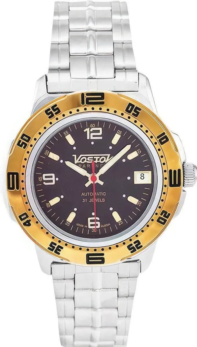 Мужские наручные часы Восток Командирские 311146. Автоматические с ручным подзаводом. Пружина механизма заводится автоматически благодаря естественным движениям владельца в процессе ежедневной носки часов. Также есть возможность ручного завода. Корпус изготовлен из высококачественной нержавеющей стали 316L с высокими антикоррозийными свойствами. На стрелки и отметки нанесен светонакопительный состав, благодаря этому считывать информацию с циферблата возможно и в темноте. На циферблате отображается текущее число месяца. Браслет из нержавеющей стали. Прочное, устойчивое к царапинам минеральное стекло защищает часы от повреждений. Часы являются водонепроницаемыми до 3 Бар. Цвет корпуса: Двухцветный. Цвет циферблата: Черный. Ширина (с заводной головкой): 42мм. Толщина: 13мм. Гарантия: 1 год.