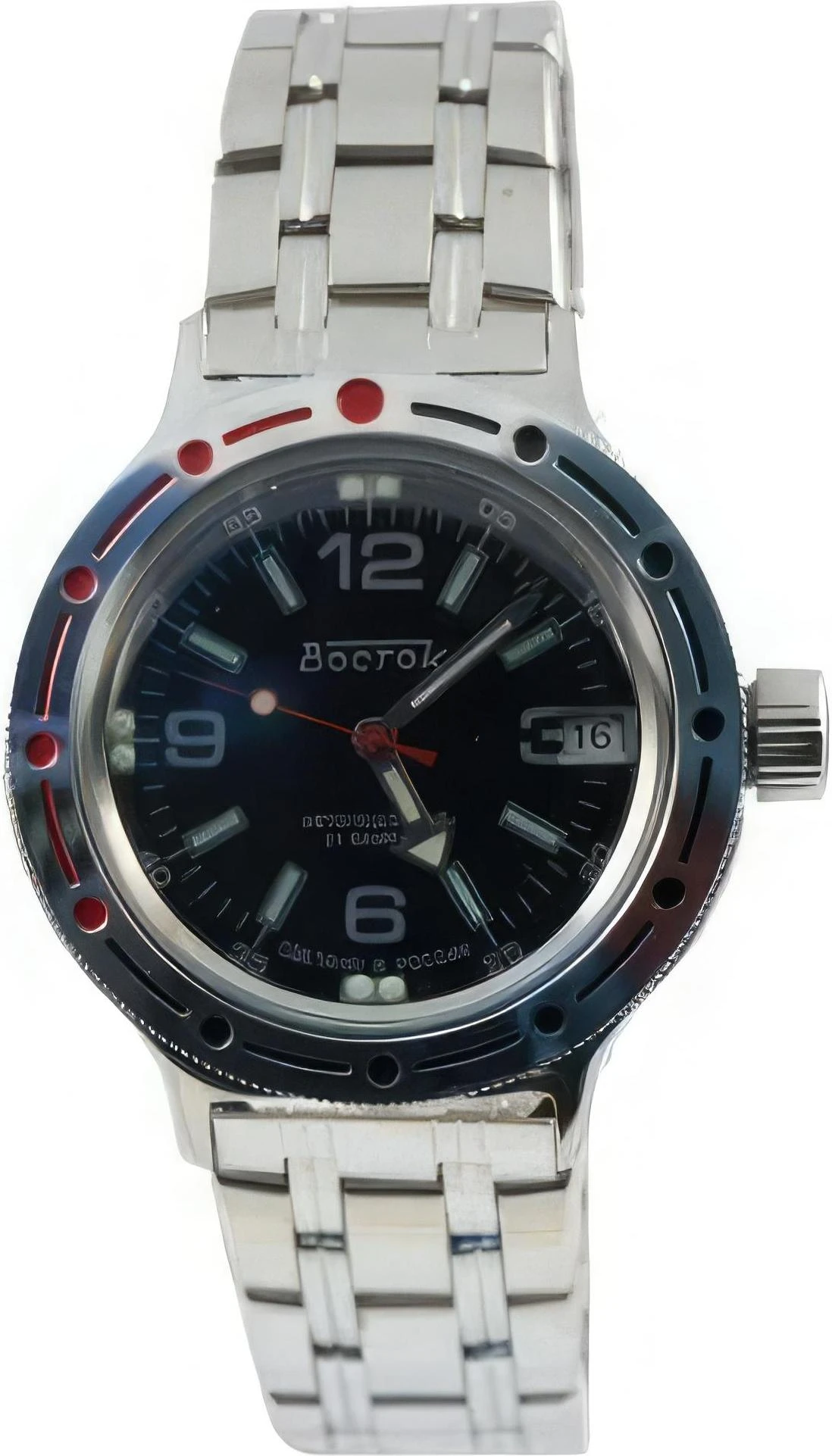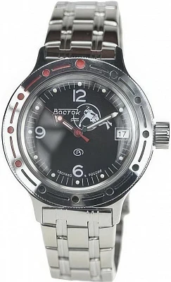 Мужские наручные часы Восток Командирские 420640. Механические с автоподзаводом. Пружина механизма заводится автоматически благодаря естественным движениям владельца в процессе ежедневной носки часов. Корпус изготовлен из высококачественной нержавеющей стали 316L с высокими антикоррозийными свойствами. На стрелки и отметки нанесен светонакопительный состав, благодаря этому считывать информацию с циферблата возможно и в темноте. На циферблате отображается текущее число месяца. Браслет из нержавеющей стали. Органическое стекло. Часы являются водонепроницаемыми до 20 Бар. Цвет корпуса: Серебристый. Цвет циферблата: Черный. Ширина (с заводной головкой): 42мм. Толщина: 15мм. Гарантия: 1 год.