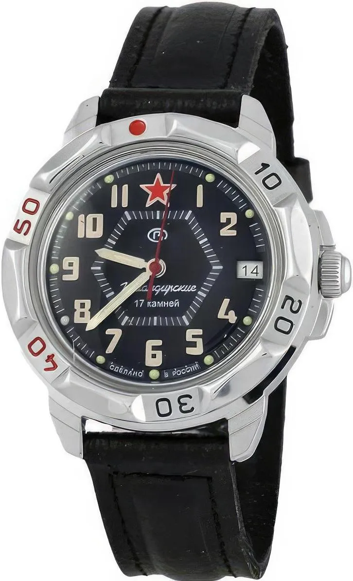 Мужские наручные часы Восток Командирские 431744. Механические с ручным подзаводом. Корпус изготовлен из высококачественной часовой латуни с высокими антикоррозийными свойствами. На стрелки и отметки нанесен светонакопительный состав, благодаря этому считывать информацию с циферблата возможно и в темноте. На циферблате отображается текущее число месяца. Ремешок изготовлен из кожи. Органическое стекло. Часы являются водонепроницаемыми до 3 Бар. Цвет циферблата: Черный. Ширина (с заводной головкой): 40мм. Толщина: 10мм. Гарантия: 1 год.