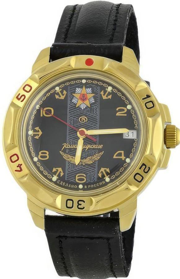 Мужские наручные часы Восток Командирские 439471. Механические с ручным подзаводом. Корпус изготовлен из высококачественной часовой латуни с высокими антикоррозийными свойствами. На стрелки и отметки нанесен светонакопительный состав, благодаря этому считывать информацию с циферблата возможно и в темноте. На циферблате отображается текущее число месяца. Ремешок изготовлен из кожи. Прочное, устойчивое к царапинам минеральное стекло защищает часы от повреждений.Часы являются водонепроницаемыми до 3 Бар. Цвет корпуса: Желтое золото. Цвет циферблата: Черный. Ширина (с заводной головкой): 40мм. Толщина: 10мм. Гарантия: 1 год.