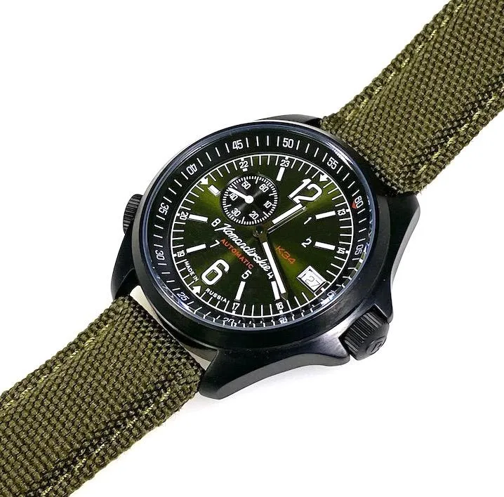 Мужские наручные часы Восток Командирские 476966. Механические с ручным подзаводом. Корпус изготовлен из высококачественной нержавеющей стали 316L с высокими антикоррозийными свойствами. На стрелки и отметки нанесен светонакопительный состав, благодаря этому считывать информацию с циферблата возможно и в темноте. На циферблате отображается текущее число месяца. Текстильный ремешок. Прочное, устойчивое к царапинам минеральное стекло защищает часы от повреждений. Часы являются водонепроницаемыми до 10 Бар. Цвет корпуса: Черный. Цвет циферблата: Зеленый. Ширина (с заводной головкой): 40мм. Толщина: 13мм. Гарантия: 1 год.