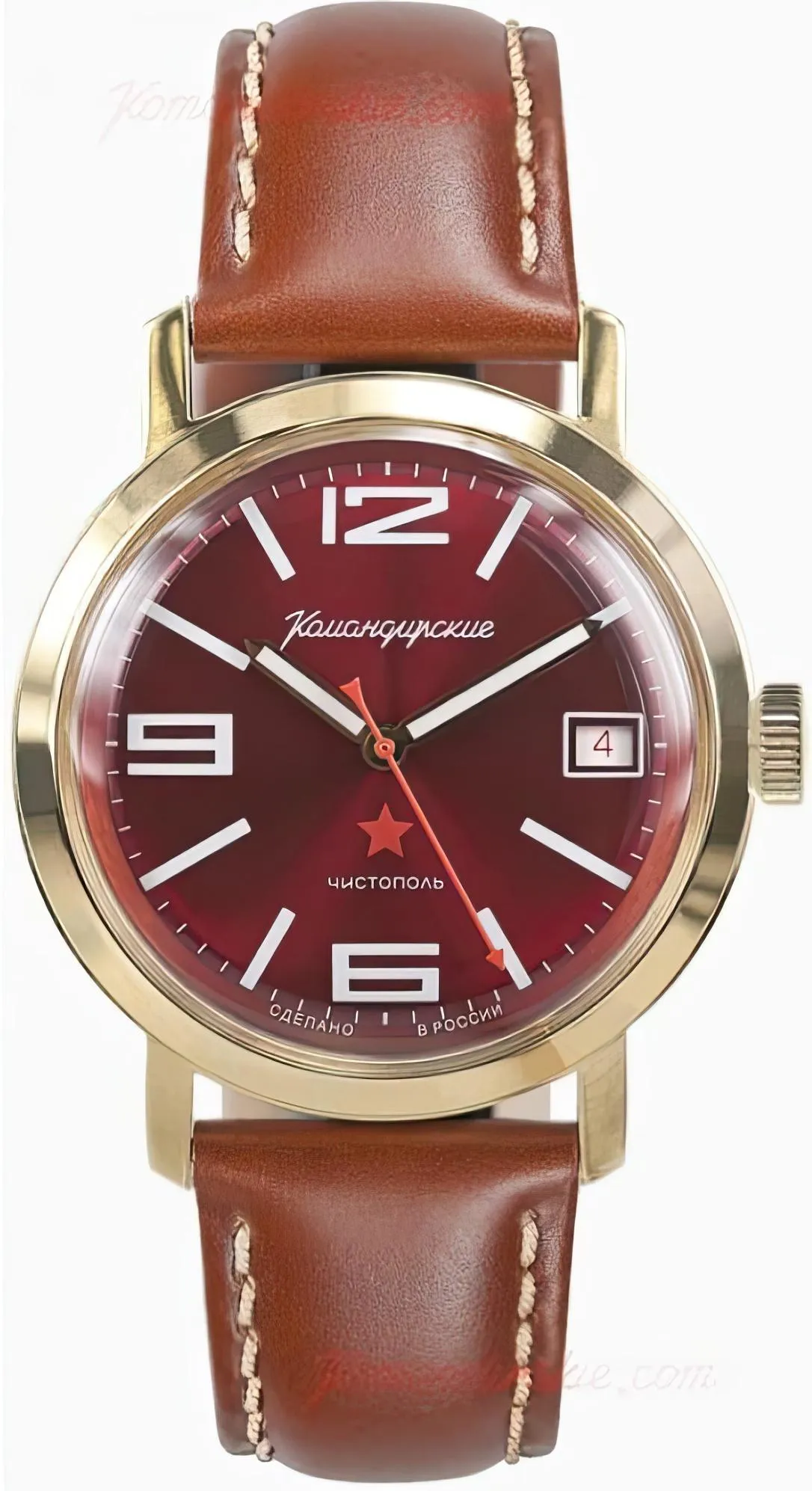 Мужские наручные часы Восток Командирские 683954. Механические с ручным подзаводом. Корпус изготовлен из высококачественной нержавеющей стали 316L с высокими антикоррозийными свойствами. На стрелки и отметки нанесен светонакопительный состав, благодаря этому считывать информацию с циферблата возможно и в темноте. На циферблате отображается текущее число месяца. Ремешок изготовлен из кожи. Прочное, устойчивое к царапинам минеральное стекло защищает часы от повреждений. Часы являются водонепроницаемыми до 3 Бар. Цвет корпуса: Желтое золото. Цвет циферблата: Красный. Ширина (с заводной головкой): 39мм. Толщина: 11мм. Гарантия: 1 год.