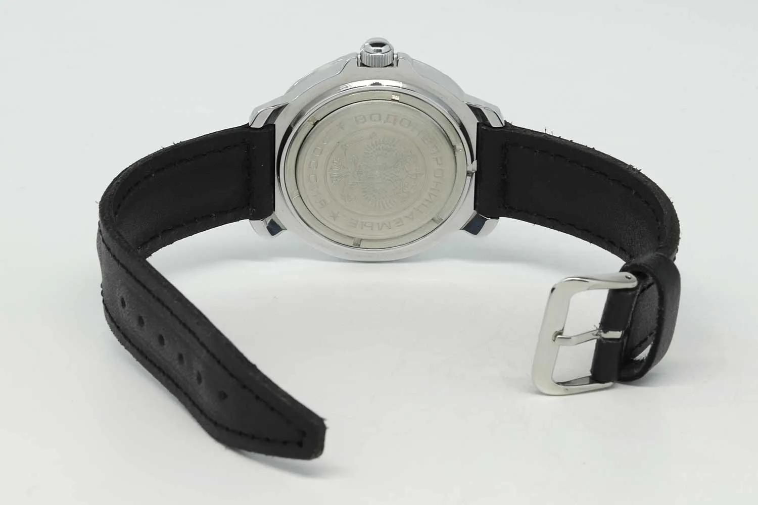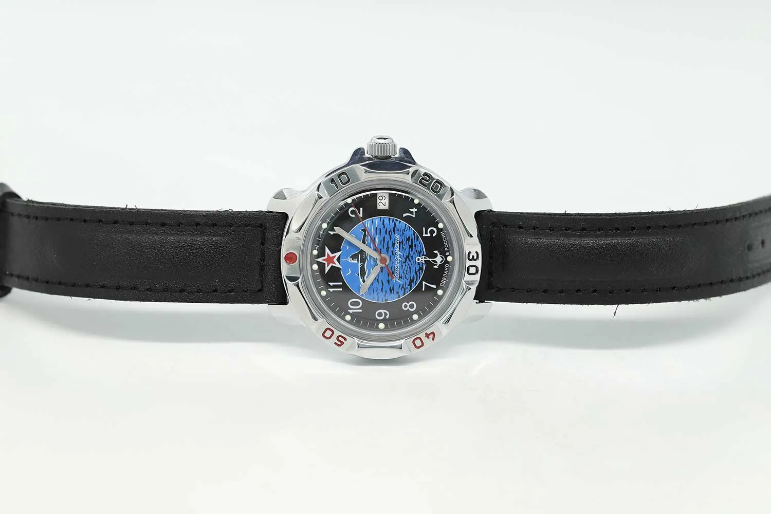 <b>Мужские наручные часы Восток Командирские 811163.</b> Механические с ручным подзаводом. Корпус изготовлен из высококачественной часовой латуни с высокими антикоррозийными свойствами. На стрелки и отметки нанесен светонакопительный состав, благодаря этому считывать информацию с циферблата возможно и в темноте. На циферблате отображается текущее число месяца. Ремешок изготовлен из кожи. Прочное, устойчивое к царапинам минеральное стекло защищает часы от повреждений.Часы являются водонепроницаемыми до 3 Бар. Цвет корпуса: Двухцветный. Цвет циферблата: Синий. Ширина (с заводной головкой): 40мм. Толщина: 10мм. Гарантия: 1 год.