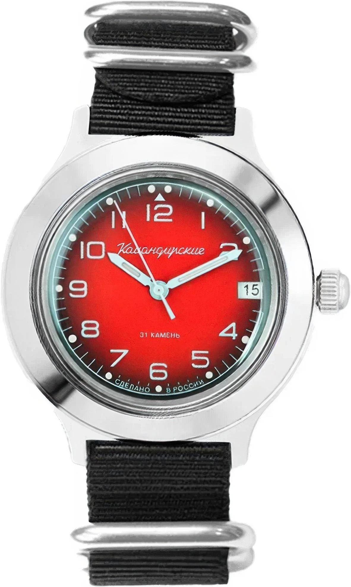 Мужские наручные часы Восток Командирские 92154В. Механические с ручным подзаводом. Текстильный ремешок. После настройки автоматический календарь всегда отображает точную дату. Латунный браслет. Органическое стекло. На циферблате отображается текущее число месяца. Часы являются водонепроницаемыми до 3 Бар. Цвет циферблата: Серебристый. Цвет корпуса: Красный. Цвет корпуса: Черный. На стрелки и отметки нанесен светонакопительный состав, благодаря этому считывать информацию с циферблата возможно и в темноте. Толщина: 15 мм. Гарантия: 1 год.