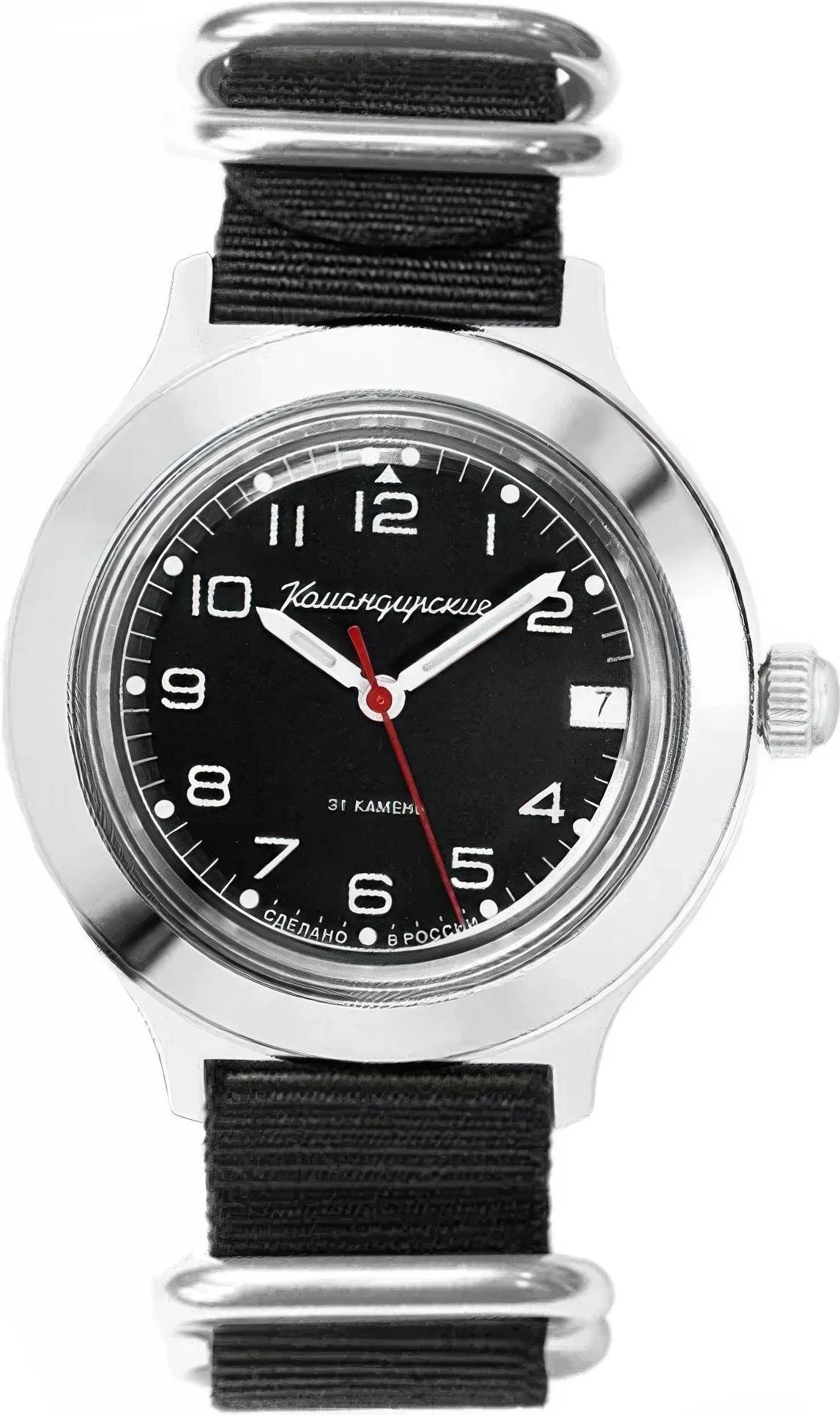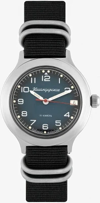 Мужские наручные часы Восток Командирские 92175Б. Механические с ручным подзаводом. Текстильный ремешок. Ударопрочная конструкция часов защищает от ударов и вибрации. После настройки автоматический календарь всегда отображает точную дату. Латунный браслет. Органическое стекло. На циферблате отображается текущее число месяца. Часы являются водонепроницаемыми до 3 Бар. Цвет циферблата: Серебристый. Цвет корпуса: Черный. На стрелки и отметки нанесен светонакопительный состав, благодаря этому считывать информацию с циферблата возможно и в темноте. Толщина: 15 мм. Гарантия: 1 год.