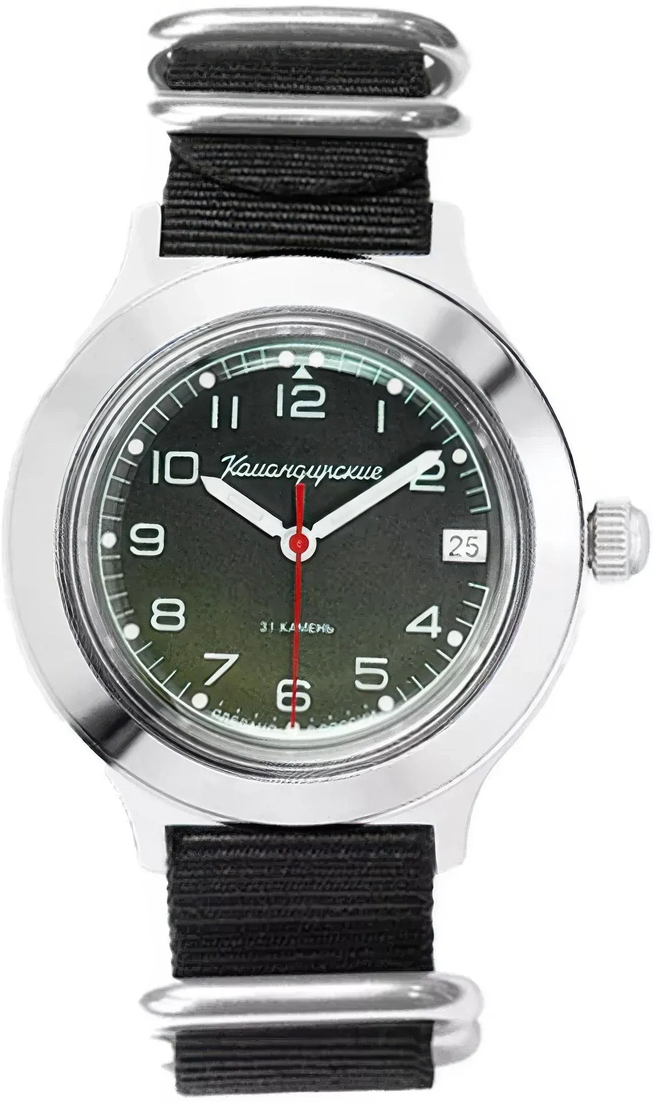 Мужские наручные часы Восток Командирские 92176Б. Механические с ручным подзаводом. Текстильный ремешок. Ударопрочная конструкция часов защищает от ударов и вибрации. После настройки автоматический календарь всегда отображает точную дату. Латунный браслет. Органическое стекло. На циферблате отображается текущее число месяца. Часы являются водонепроницаемыми до 3 Бар. Цвет циферблата: Серебристый. Цвет корпуса: Зеленый. На стрелки и отметки нанесен светонакопительный состав, благодаря этому считывать информацию с циферблата возможно и в темноте. Толщина: 15 мм. Гарантия: 1 год.