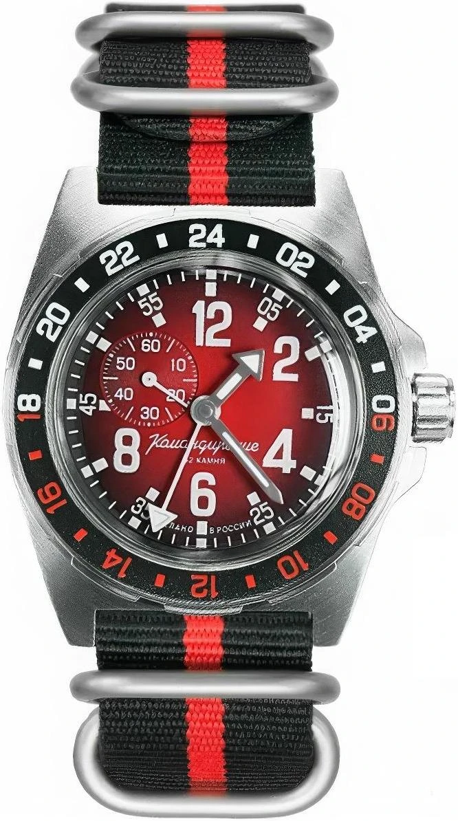 Мужские наручные часы Восток Командирские 95060Б. Механические с ручным подзаводом. Текстильный ремешок. Функция хронографа. Браслет из нержавеющей стали. Органическое стекло. Часы являются водонепроницаемыми до 20 Бар. Цвет циферблата: Черный. Цвет корпуса: Красный. На стрелки и отметки нанесен светонакопительный состав, благодаря этому считывать информацию с циферблата возможно и в темноте. Высота (с ушками): 49 мм. Толщина: 15 мм. Гарантия: 1 год.