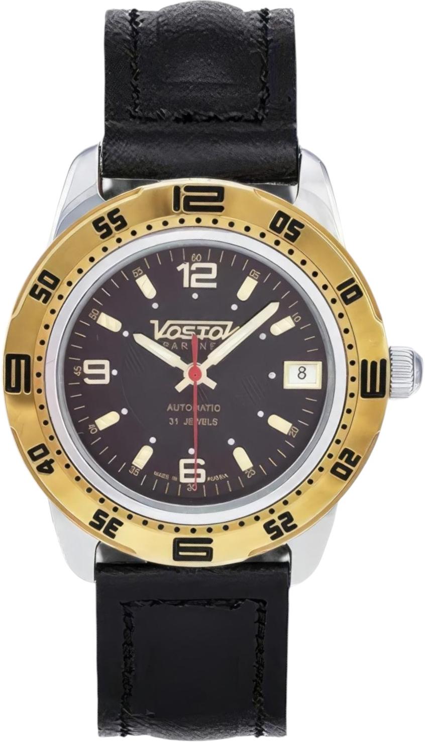 Мужские наручные часы Восток Партнер 291146. Механические с ручным подзаводом. Ремешок изготовлен из кожи. Браслет из нержавеющей стали. Прочное, устойчивое к царапинам минеральное стекло защищает часы от повреждений. На циферблате отображается текущее число месяца. Часы являются водонепроницаемыми до 3 Бар. Цвет циферблата: Серебристый. Цвет циферблата: Желтое золото. Цвет корпуса: Черный. На стрелки и отметки нанесен светонакопительный состав, благодаря этому считывать информацию с циферблата возможно и в темноте. Толщина: 12 мм. Гарантия: 1 год.