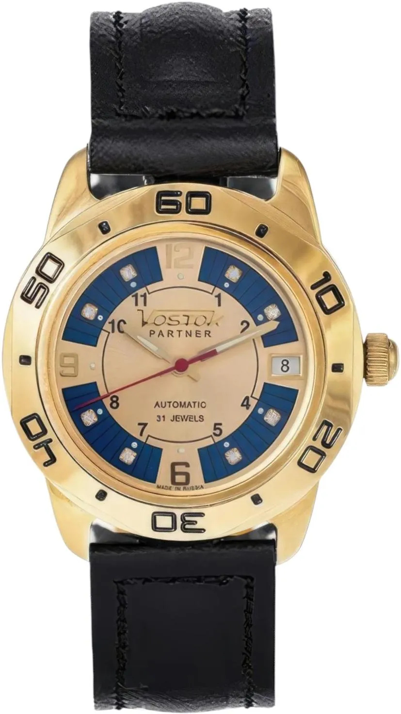 Мужские наручные часы Восток Партнер 299097. Механические с ручным подзаводом. Ремешок изготовлен из кожи. Браслет из нержавеющей стали. Прочное, устойчивое к царапинам минеральное стекло защищает часы от повреждений. На циферблате отображается текущее число месяца. Часы являются водонепроницаемыми до 3 Бар. Цвет циферблата: Желтое золото. Цвет корпуса: Синий. Цвет корпуса: Золотистый. Толщина: 10 мм. Гарантия: 1 год.