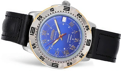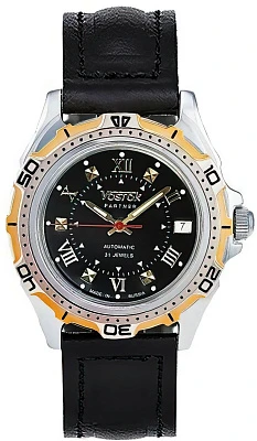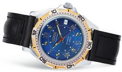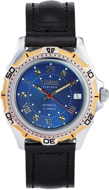 Мужские наручные часы Восток Партнер 30158А. Автоматические с ручным подзаводом. Пружина механизма заводится автоматически благодаря естественным движениям владельца в процессе ежедневной носки часов. Также есть возможность ручного завода. Ремешок изготовлен из кожи. Браслет из нержавеющей стали. Прочное, устойчивое к царапинам минеральное стекло защищает часы от повреждений. На циферблате отображается текущее число месяца. Часы являются водонепроницаемыми до 3 Бар. Цвет циферблата: Серебристый. Цвет циферблата: Желтое золото. Цвет корпуса: Синий. На стрелки и отметки нанесен светонакопительный состав, благодаря этому считывать информацию с циферблата возможно и в темноте. Толщина: 13 мм. Гарантия: 1 год.