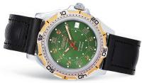Мужские наручные часы Восток Партнер 30159А. Механические с ручным подзаводом. Ремешок изготовлен из кожи. Браслет из нержавеющей стали. Прочное, устойчивое к царапинам минеральное стекло защищает часы от повреждений. На циферблате отображается текущее число месяца. Часы являются водонепроницаемыми до 3 Бар. Цвет циферблата: Серебристый. Цвет циферблата: Желтое золото. Цвет корпуса: Зеленый. На стрелки и отметки нанесен светонакопительный состав, благодаря этому считывать информацию с циферблата возможно и в темноте. Толщина: 13 мм. Гарантия: 1 год.