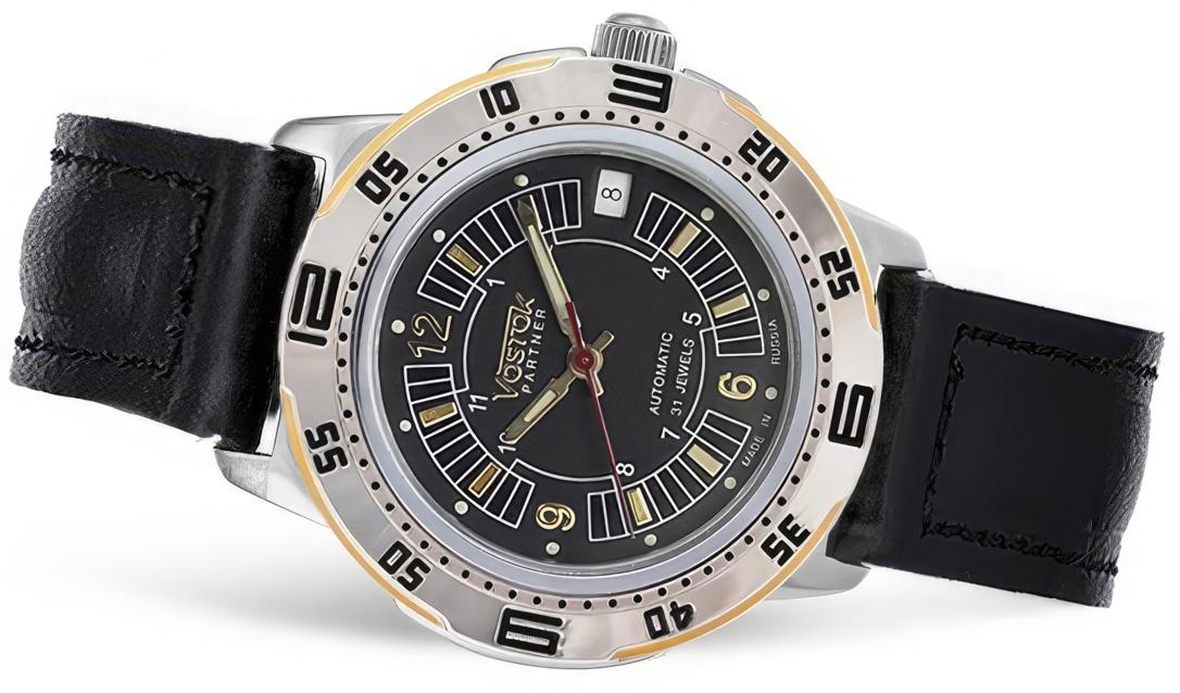 Мужские наручные часы Восток Партнер 31160А. Механические с ручным подзаводом. Ремешок изготовлен из кожи. Браслет из нержавеющей стали. Прочное, устойчивое к царапинам минеральное стекло защищает часы от повреждений. На циферблате отображается текущее число месяца. Часы являются водонепроницаемыми до 3 Бар. Цвет циферблата: Серебристый. Цвет циферблата: Желтое золото. Цвет корпуса: Черный. На стрелки и отметки нанесен светонакопительный состав, благодаря этому считывать информацию с циферблата возможно и в темноте. Толщина: 14 мм. Гарантия: 1 год.